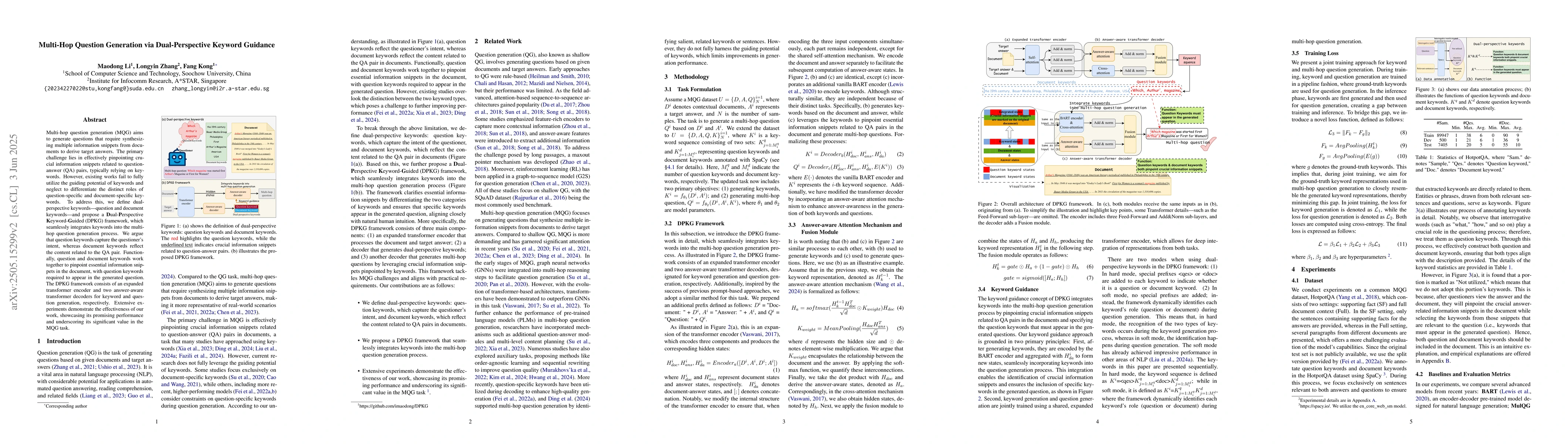 This research is significant as it addresses the challenge of effectively utilizing keywords in MQG, differentiating between question-specific and document-specific keywords, and enhancing the generation of multi-hop questions.