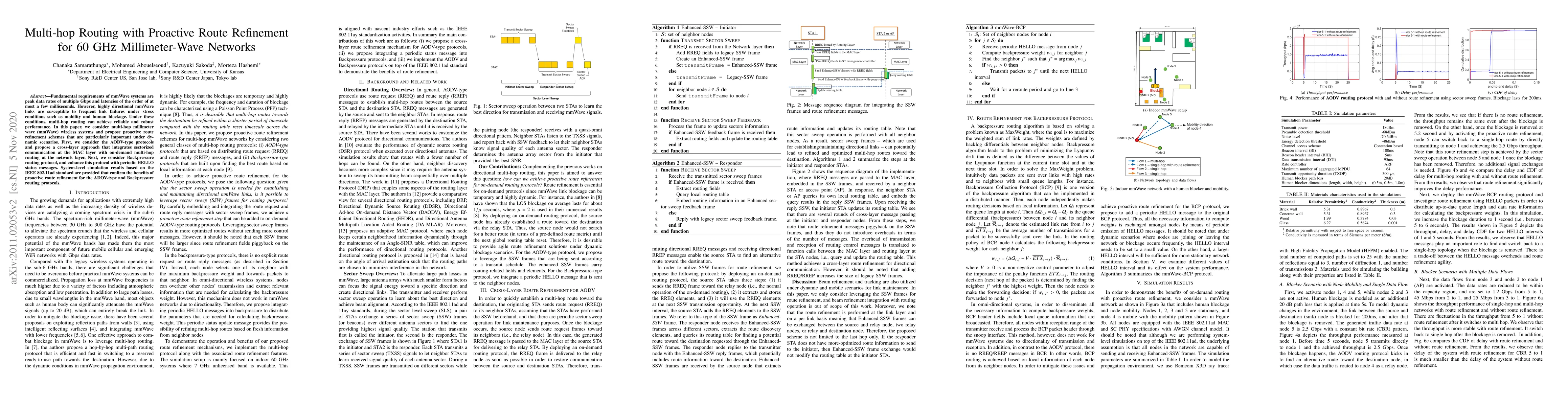 This paper proposes proactive route refinement schemes for multi-hop millimeter-wave networks to enhance reliability under dynamic conditions. It integrates sectorized communication with on-demand routing and enhances Backpressure routing with periodic HELLO messages, demonstrating improved performance via simulation.