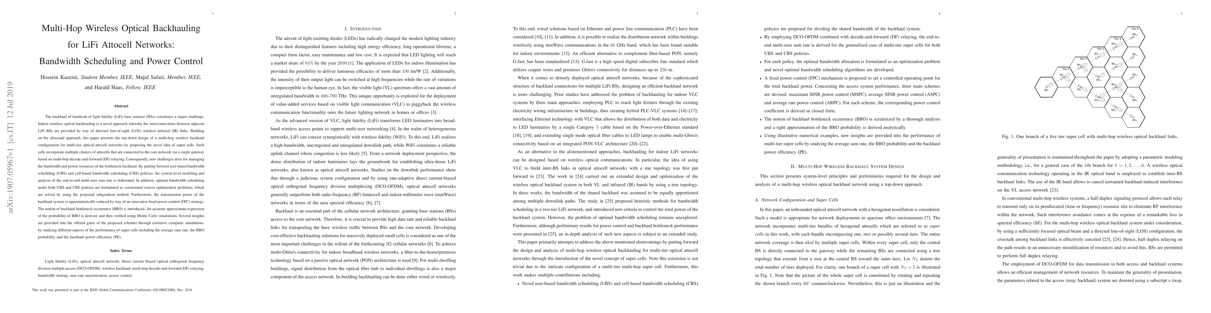 This paper proposes a multi-hop wireless optical backhauling approach for LiFi attocell networks using super cells with decode-and-forward relaying. The study introduces user-based and cell-based bandwidth scheduling policies and a fixed power control strategy to optimize bandwidth and reduce backhaul power, providing insights into performance gains through simulation.