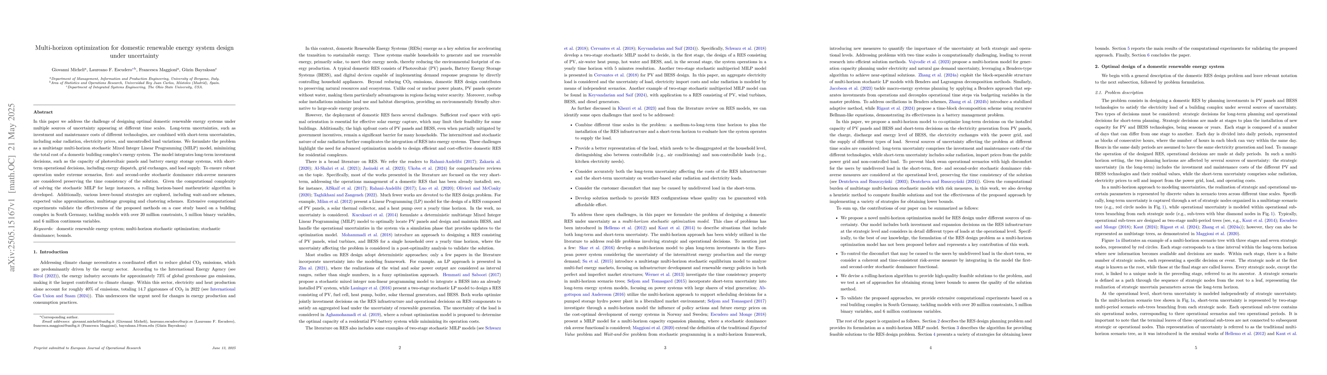 The research formulates the domestic renewable energy system design problem as a multistage multi-horizon stochastic Mixed Integer Linear Programming (MILP) model, integrating long-term investment decisions with short-term operational decisions. A rolling horizon-based matheuristic algorithm is developed to address computational complexity, along with various lower-bound strategies.