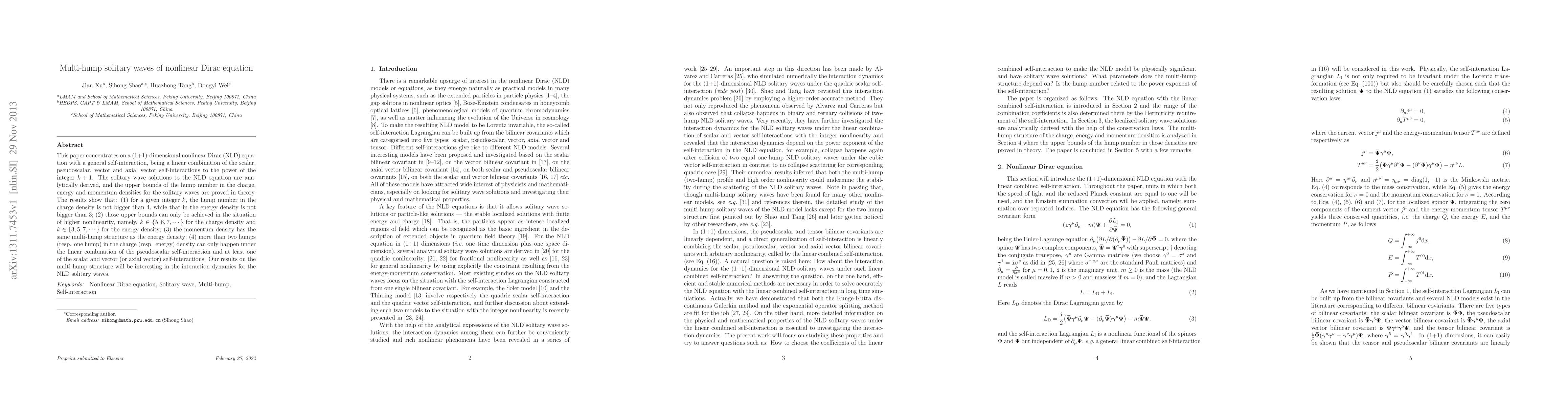 This paper analytically derives solitary wave solutions for a (1+1)-dimensional nonlinear Dirac equation with general self-interactions. It proves theoretical upper bounds for the hump numbers in charge, energy, and momentum densities, revealing intricate dynamics in the interaction of these solitary waves.