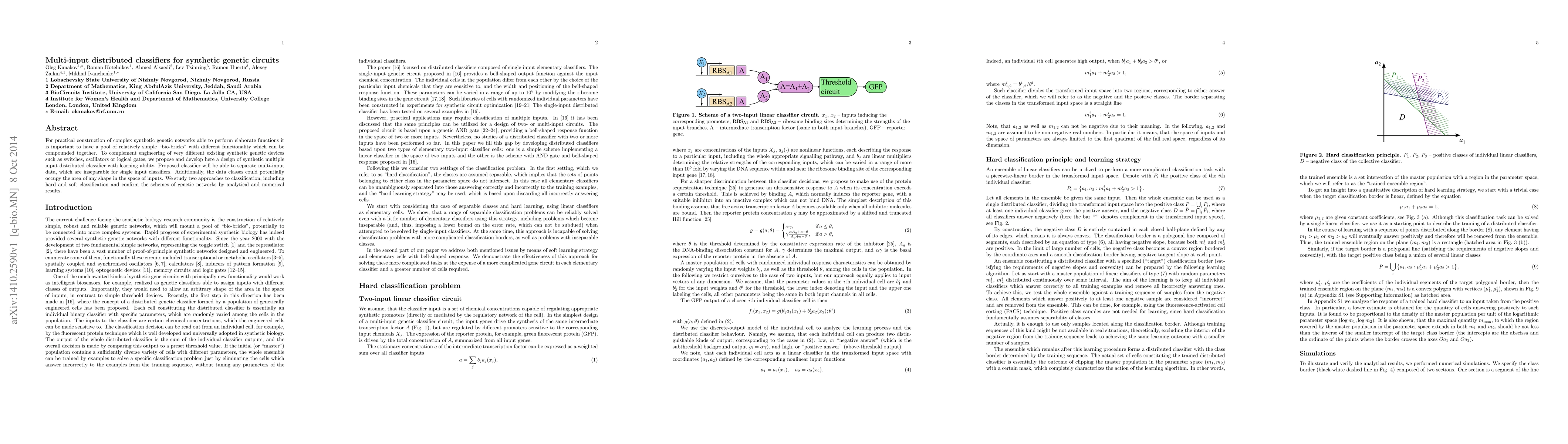 The paper presents a design for multi-input distributed classifiers implemented as synthetic genetic networks, combining genetic modules for sensing and signal transduction, and proposes two learning strategies (hard and soft) for classification tasks.