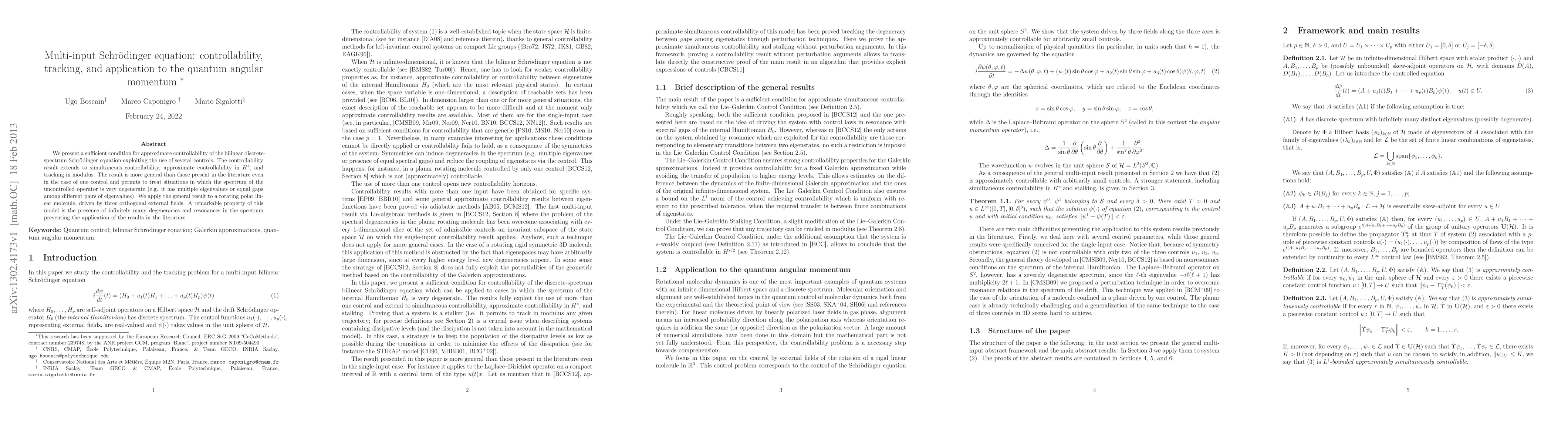 This paper presents a novel sufficient condition for the approximate controllability of a bilinear discrete-spectrum Schrödinger equation using multiple controls. The results extend to simultaneous controllability and tracking, and are applicable even when the spectrum is highly degenerate, as demonstrated in the context of a rotating polar linear molecule with three orthogonal external fields.