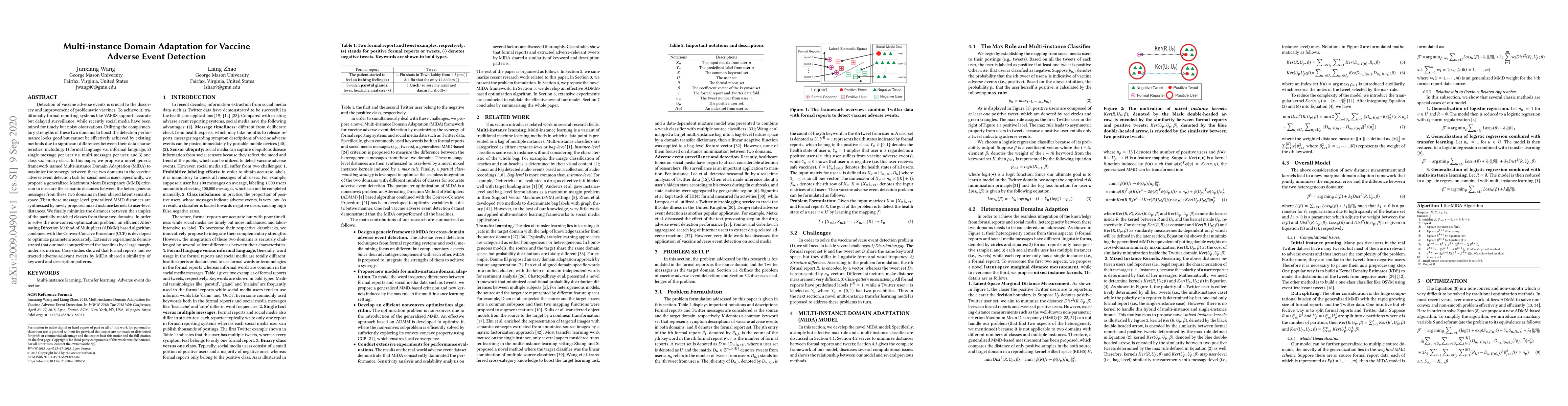 This paper proposes a Multi-instance Domain Adaptation (MIDA) framework to enhance vaccine adverse event detection by leveraging both formal reporting systems and social media data. The method uses a generalized Maximum Mean Discrepancy criterion and mixed instance kernels to bridge the differences in data characteristics between these domains, achieving superior performance over baselines.