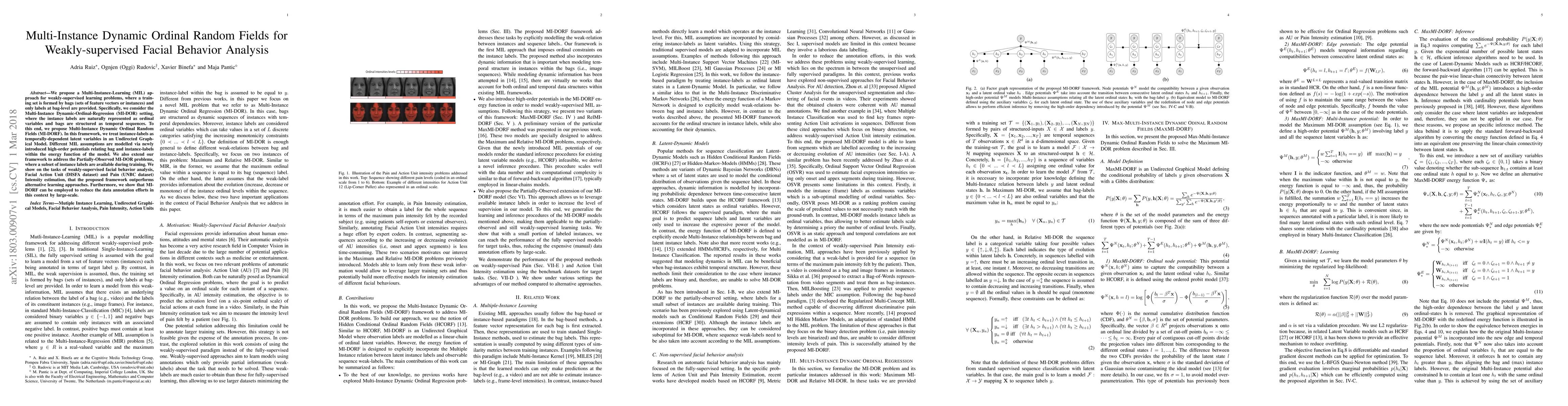 This paper proposes a Multi-Instance Dynamic Ordinal Random Fields (MI-DORF) approach for weakly-supervised learning, specifically for facial behavior analysis. The method treats instance labels as temporally-dependent latent variables and outperforms alternative methods on DISFA and UNBC datasets, significantly reducing data annotation efforts.