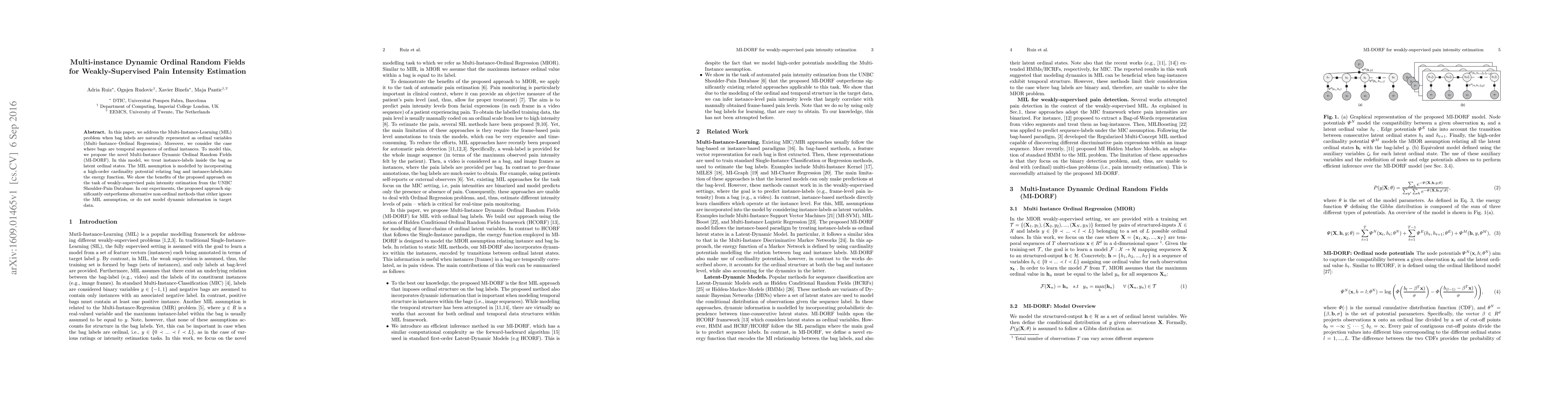 This paper introduces Multi-Instance Dynamic Ordinal Random Fields (MI-DORF) to address the Multi-Instance-Learning problem with ordinal labels and temporal sequences. The proposed model significantly outperforms non-ordinal methods in the task of weakly-supervised pain intensity estimation from the UNBC Shoulder-Pain Database.