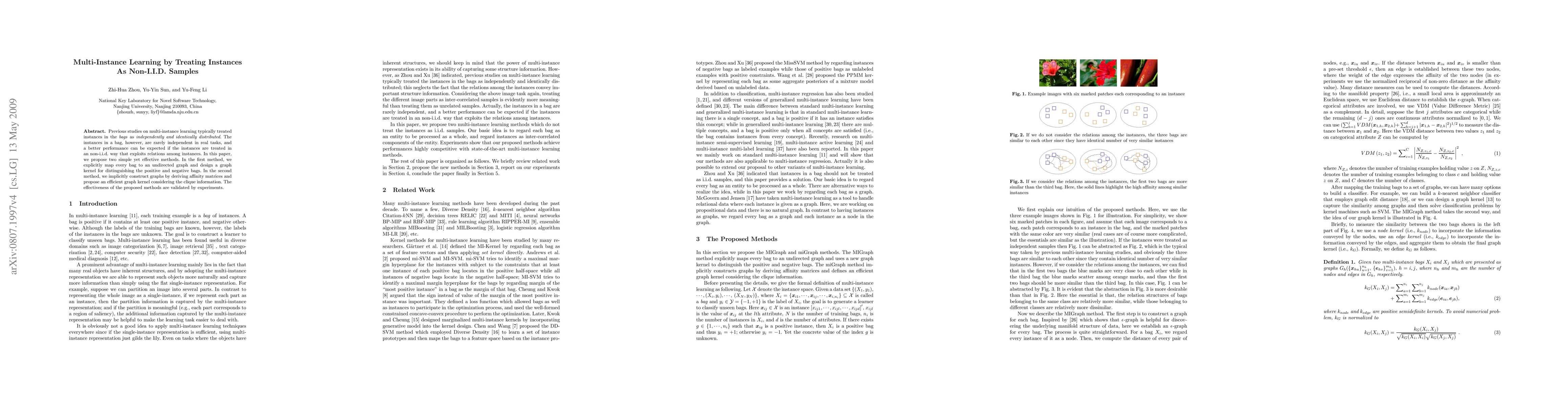 This paper proposes a novel multi-instance learning method that treats instances within a bag as non-independent and identically distributed (non-i.i.d.), leveraging graph kernels to capture relationships among instances. Experimental results demonstrate the effectiveness of the approach.