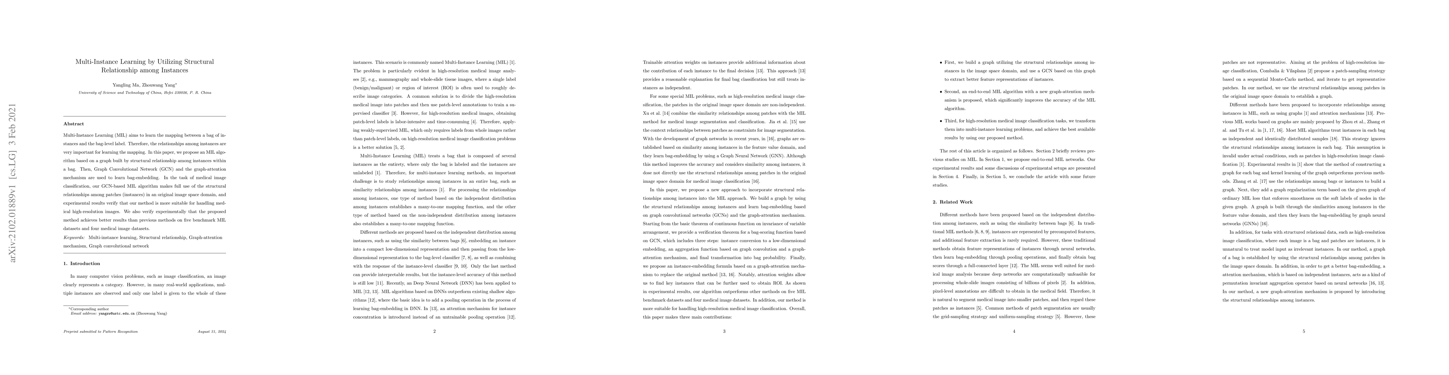 This paper proposes a Multi-Instance Learning (MIL) algorithm that leverages structural relationships among instances using a graph-based approach. The method employs Graph Convolutional Networks (GCN) and graph-attention mechanisms to learn bag-embeddings, demonstrating superior performance in medical image classification and outperforming previous methods on benchmark datasets.