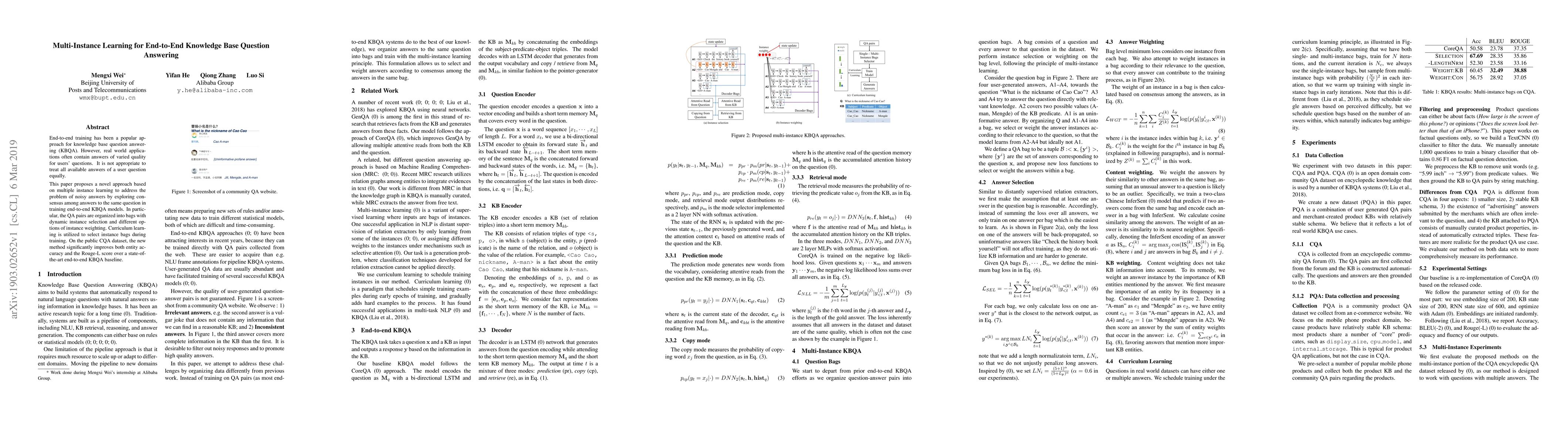 This paper introduces a multi-instance learning approach to enhance end-to-end knowledge base question answering by addressing noisy answers through consensus among multiple answers. The method improves entity accuracy and Rouge-L score on a public CQA dataset compared to existing baselines.