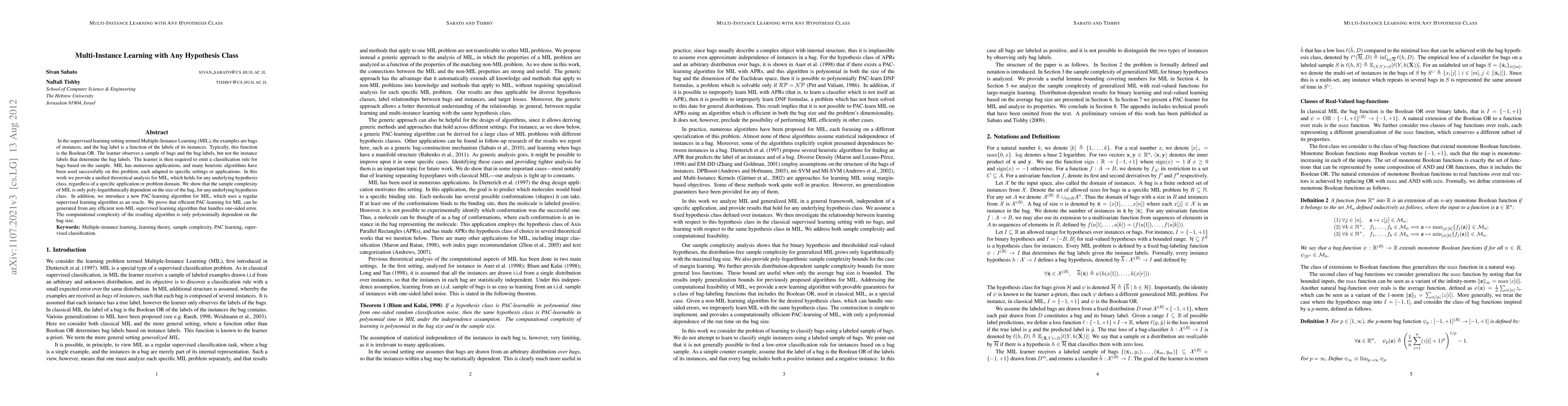 This paper analyzes Multiple-Instance Learning (MIL), a supervised learning setting where examples are bags of instances with bag labels determined by instance labels. It provides a unified theoretical analysis showing efficient PAC-learning for MIL can be generated from any efficient non-MIL supervised learning algorithm.