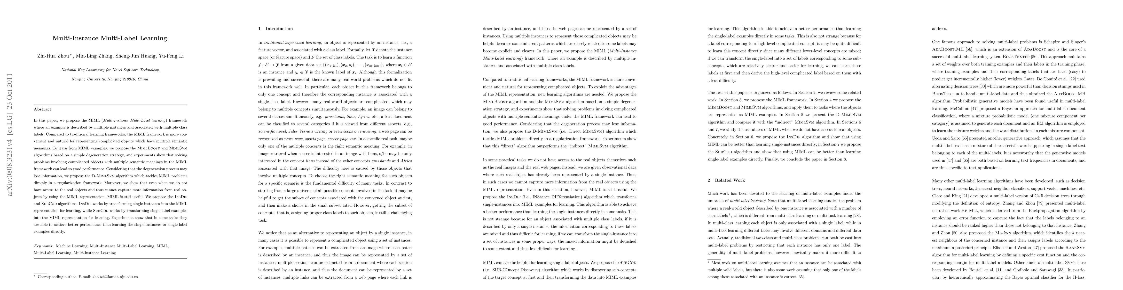 This paper introduces the MIML framework for representing complex objects with multiple semantic meanings through multiple instances and labels. It proposes MimlBoost and MimlSvm algorithms, along with D-MimlSvm to address MIML problems directly, and InsDif and SubCod to transform single-instance and single-label examples into MIML for improved learning performance.