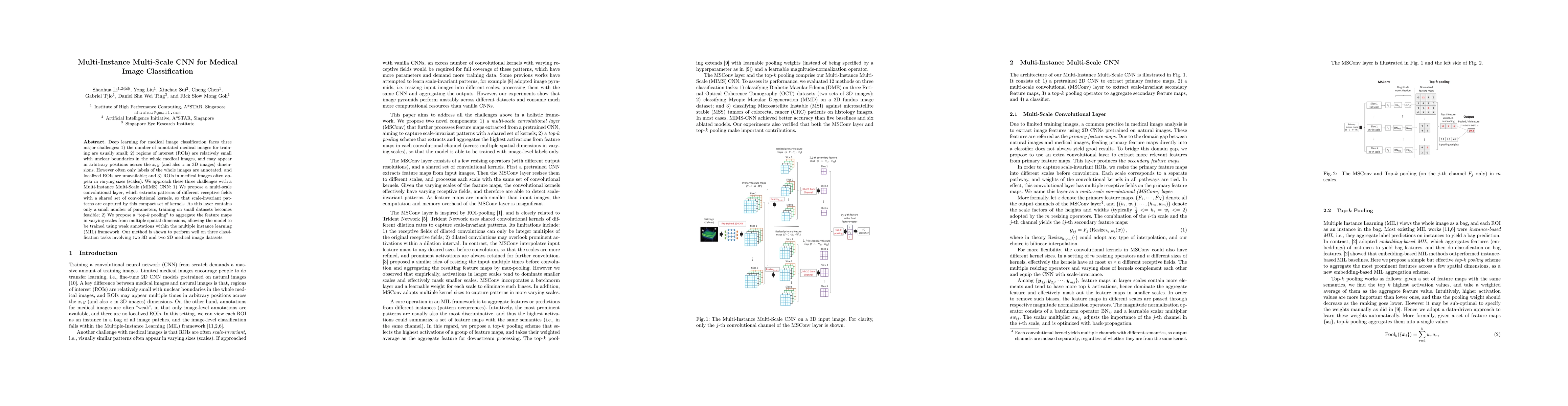 This paper proposes a Multi-Instance Multi-Scale (MIMS) CNN to address the challenges of small annotated datasets, small and unclear regions of interest, and varying ROI sizes in medical image classification. The MIMS CNN uses a multi-scale convolutional layer and top-k pooling to efficiently extract scale-invariant patterns and aggregate features from multiple scales, enabling effective training on limited data.