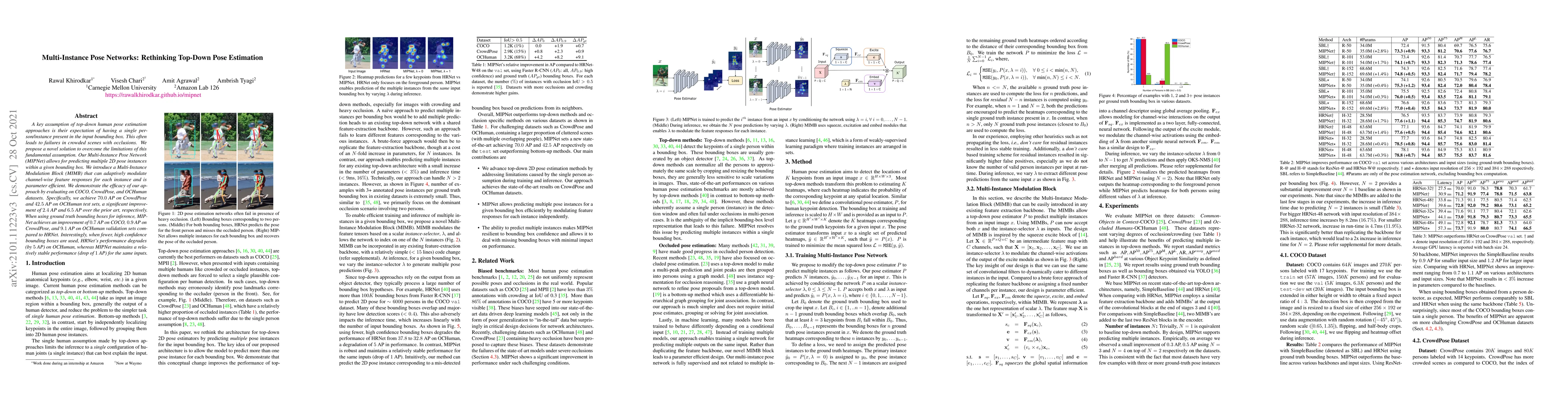 The paper proposes Multi-Instance Pose Network (MIPNet) to address top-down human pose estimation in crowded scenes, introducing a Multi-Instance Modulation Block (MIMB) for adaptive feature modulation. MIPNet significantly improves pose estimation accuracy on crowded datasets, outperforming prior methods by notable margins.