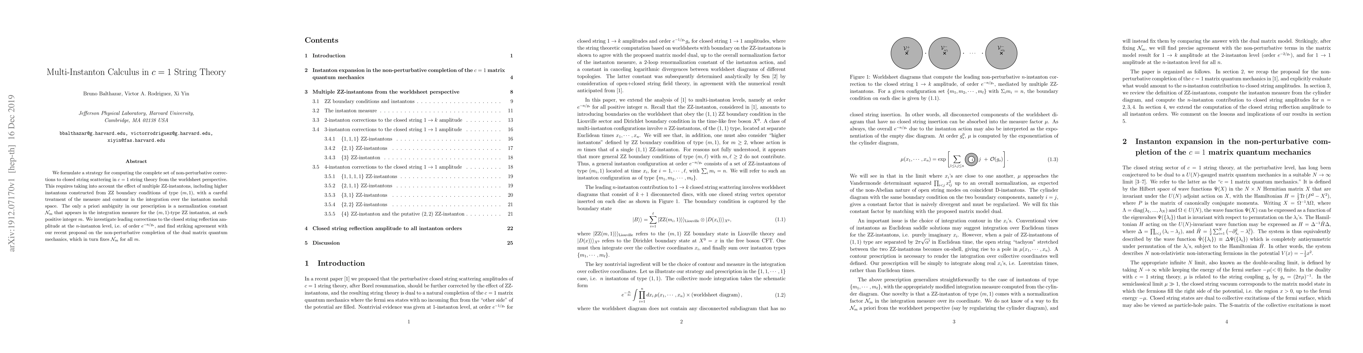 We formulate a strategy for computing the complete set of non-perturbative corrections to closed string scattering in $c=1$ string theory from the worldsheet perspective. This requires taking into account the effect of multiple ZZ-instantons, including higher instantons constructed from ZZ boundary conditions of type $(m,1)$, with a careful treatment of the measure and contour in the integration over the instanton moduli space. The only a priori ambiguity in our prescription is a normalization constant ${\cal N}_{m}$ that appears in the integration measure for the $(m,1)$-type ZZ instanton, at each positive integer $m$. We investigate leading corrections to the closed string reflection amplitude at the $n$-instanton level, i.e. of order $e^{-n/g_s}$, and find striking agreement with our recent proposal on the non-perturbative completion of the dual matrix quantum mechanics, which in turn fixes ${\cal N}_{m}$ for all $m$.