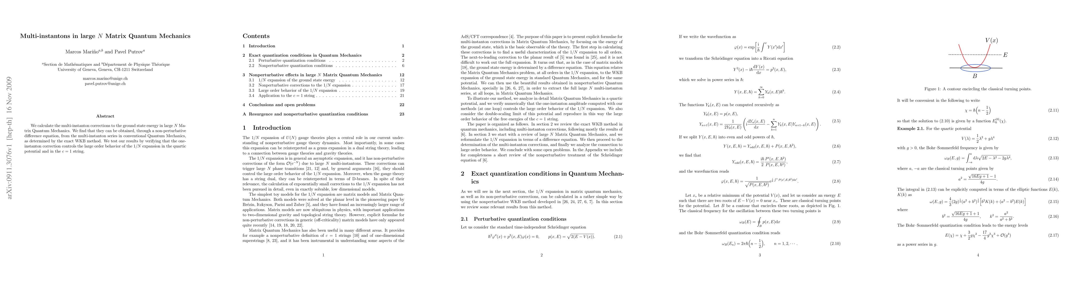 This paper calculates multi-instanton corrections to ground state energy in large $N$ Matrix Quantum Mechanics using a non-perturbative difference equation derived from conventional Quantum Mechanics. It verifies these results by showing the one-instanton correction governs large order behavior in the $1/N$ expansion for quartic potential and $c=1$ string.