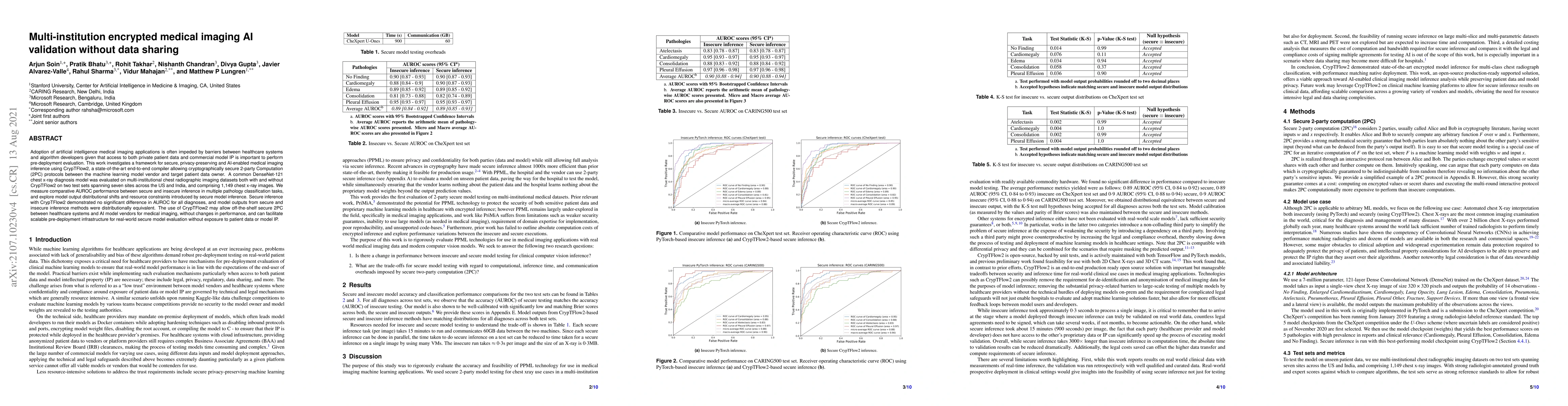 This research proposes a secure framework for validating AI-driven medical imaging applications using CrypTFlow2, enabling cryptographically secure two-party computation between model vendors and healthcare systems without sharing patient data. The study shows that CrypTFlow2 maintains diagnostic performance and output distribution, suggesting it can facilitate secure, scalable pre-deployment evaluations.