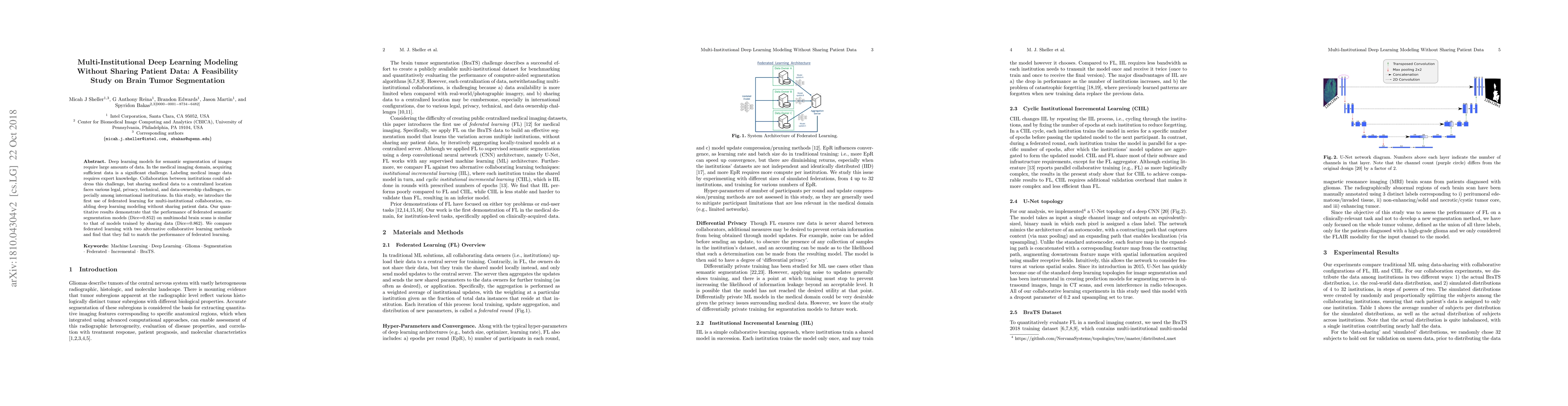 This study explores the feasibility of using federated learning for multi-institutional deep learning modeling in brain tumor segmentation without sharing patient data, demonstrating comparable performance to centralized data-sharing methods. The results show that federated learning outperforms alternative collaborative methods.