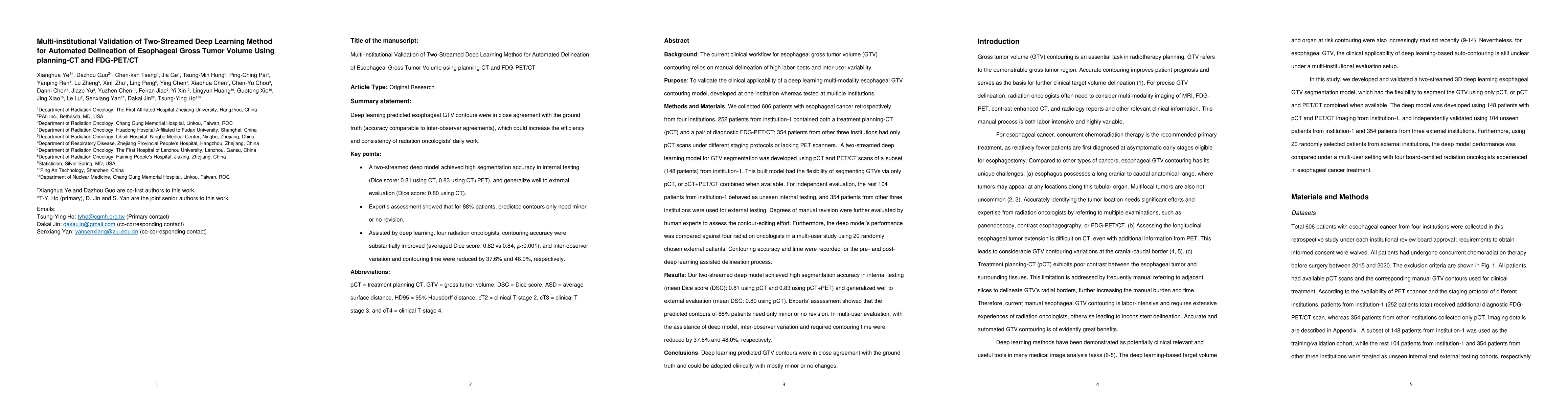 Background: The current clinical workflow for esophageal gross tumor volume (GTV) contouring relies on manual delineation of high labor-costs and interuser variability. Purpose: To validate the clinical applicability of a deep learning (DL) multi-modality esophageal GTV contouring model, developed at 1 institution whereas tested at multiple ones. Methods and Materials: We collected 606 esophageal cancer patients from four institutions. 252 institution-1 patients had a treatment planning-CT (pCT) and a pair of diagnostic FDG-PETCT; 354 patients from other 3 institutions had only pCT. A two-streamed DL model for GTV segmentation was developed using pCT and PETCT scans of a 148 patient institution-1 subset. This built model had the flexibility of segmenting GTVs via only pCT or pCT+PETCT combined. For independent evaluation, the rest 104 institution-1 patients behaved as unseen internal testing, and 354 institutions 2-4 patients were used for external testing. We evaluated manual revision degrees by human experts to assess the contour-editing effort. The performance of the deep model was compared against 4 radiation oncologists in a multiuser study with 20 random external patients. Contouring accuracy and time were recorded for the pre-and post-DL assisted delineation process. Results: Our model achieved high segmentation accuracy in internal testing (mean Dice score: 0.81 using pCT and 0.83 using pCT+PET) and generalized well to external evaluation (mean DSC: 0.80). Expert assessment showed that the predicted contours of 88% patients need only minor or no revision. In multi-user evaluation, with the assistance of a deep model, inter-observer variation and required contouring time were reduced by 37.6% and 48.0%, respectively. Conclusions: Deep learning predicted GTV contours were in close agreement with the ground truth and could be adopted clinically with mostly minor or no changes.