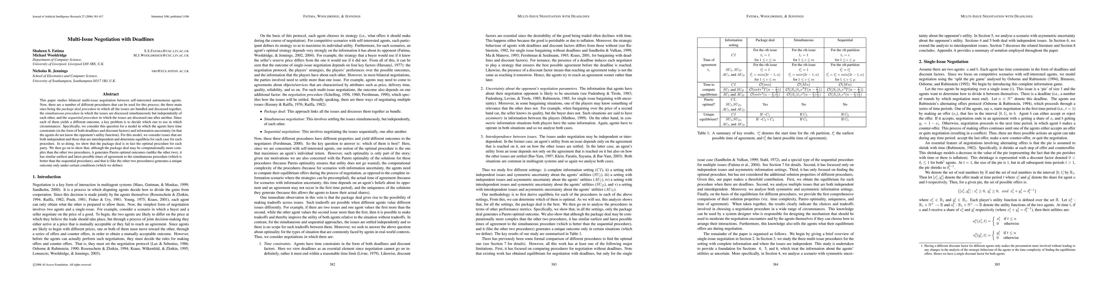This paper studies multi-issue negotiation with deadlines between self-interested autonomous agents, showing that the package deal procedure is optimal for both parties in terms of generating Pareto optimal outcomes.