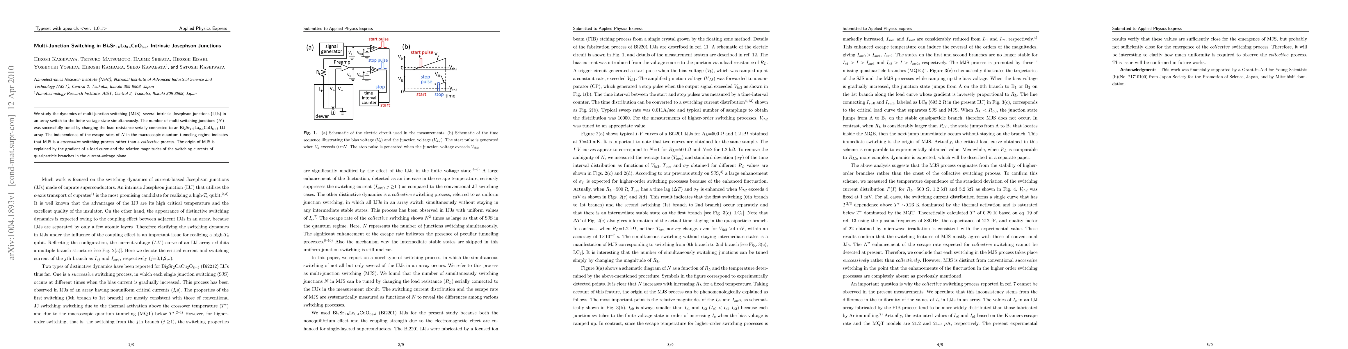 This paper investigates the dynamics of multi-junction switching in intrinsic Josephson junctions within a Bi$_2$Sr$_{1.6}$La$_{0.4}$CuO$_{6+\delta}$ array, demonstrating that the number of switching junctions can be controlled by load resistance. The study concludes that multi-junction switching is a successive, rather than collective, process, explained by load curve gradients and the relative switching currents of quasiparticle branches.