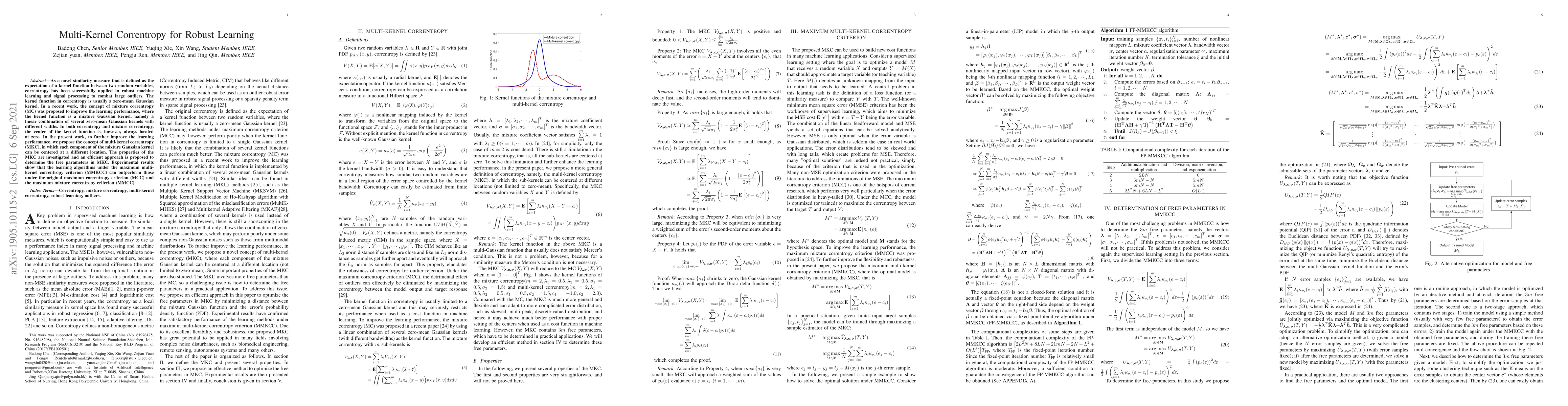 This paper introduces multi-kernel correntropy (MKC) to enhance robust learning by allowing each Gaussian kernel component to be centered at different locations, improving performance over traditional correntropy and mixture correntropy. The study proposes an efficient method for determining MKC parameters and demonstrates superior results in learning algorithms using the maximum multi-kernel correntropy criterion (MMKCC).