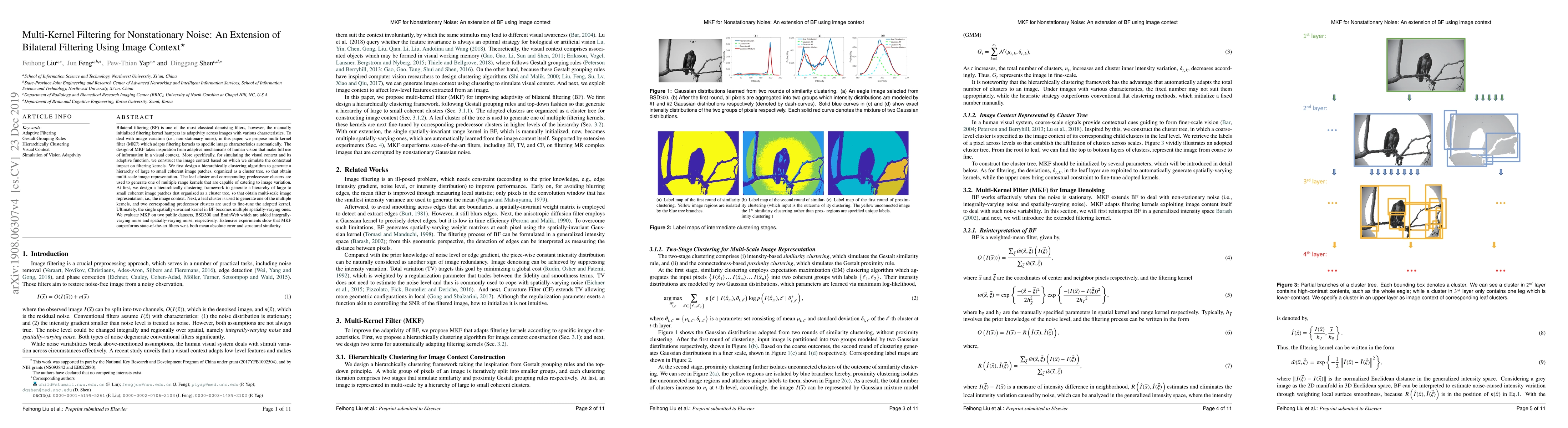 Bilateral filtering (BF) is one of the most classical denoising filters, however, the manually initialized filtering kernel hampers its adaptivity across images with various characteristics. To deal with image variation (i.e., non-stationary noise), in this paper, we propose multi-kernel filter (MKF) which adapts filtering kernels to specific image characteristics automatically. The design of MKF takes inspiration from adaptive mechanisms of human vision that make full use of information in a visual context. More specifically, for simulating the visual context and its adaptive function, we construct the image context based on which we simulate the contextual impact on filtering kernels. We first design a hierarchically clustering algorithm to generate a hierarchy of large to small coherent image patches, organized as a cluster tree, so that obtain multi-scale image representation. The leaf cluster and corresponding predecessor clusters are used to generate one of multiple range kernels that are capable of catering to image variation. At first, we design a hierarchically clustering framework to generate a hierarchy of large to small coherent image patches that organized as a cluster tree, so that obtain multi-scale image representation, i.e., the image context. Next, a leaf cluster is used to generate one of the multiple kernels, and two corresponding predecessor clusters are used to fine-tune the adopted kernel. Ultimately, the single spatially-invariant kernel in BF becomes multiple spatially-varying ones. We evaluate MKF on two public datasets, BSD300 and BrainWeb which are added integrally-varying noise and spatially-varying noise, respectively. Extensive experiments show that MKF outperforms state-of-the-art filters w.r.t. both mean absolute error and structural similarity.