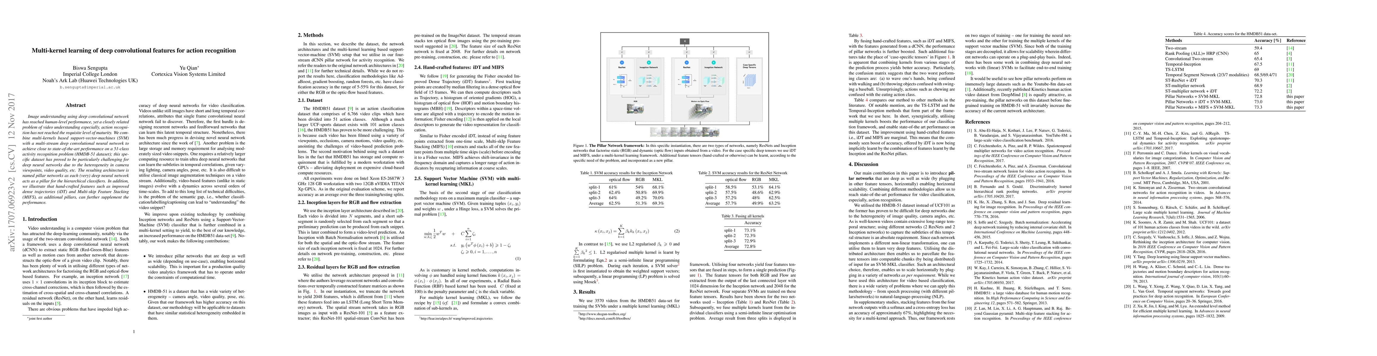 This paper combines multi-kernel SVMs with a multi-stream deep convolutional neural network to enhance action recognition performance on the HMDB-51 dataset. The proposed "pillar networks" architecture, which integrates deep neural networks and hand-crafted features, achieves near state-of-the-art results despite the dataset's challenges.