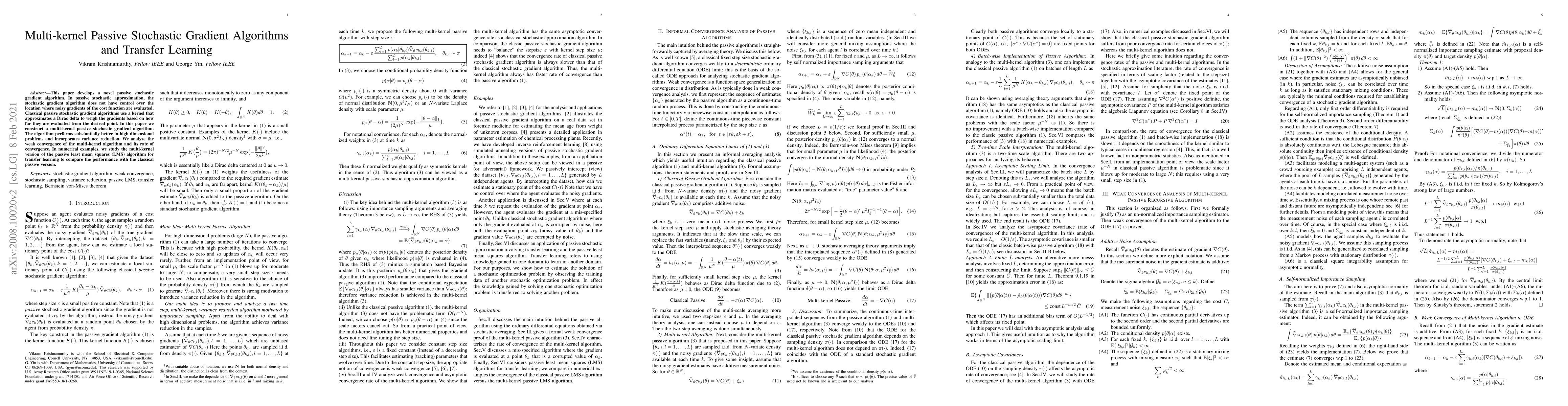 This paper develops a novel passive stochastic gradient algorithm. In passive stochastic approximation, the stochastic gradient algorithm does not have control over the location where noisy gradients of the cost function are evaluated. Classical passive stochastic gradient algorithms use a kernel that approximates a Dirac delta to weigh the gradients based on how far they are evaluated from the desired point. In this paper we construct a multi-kernel passive stochastic gradient algorithm. The algorithm performs substantially better in high dimensional problems and incorporates variance reduction. We analyze the weak convergence of the multi-kernel algorithm and its rate of convergence. In numerical examples, we study the multi-kernel version of the passive least mean squares (LMS) algorithm for transfer learning to compare the performance with the classical passive version.