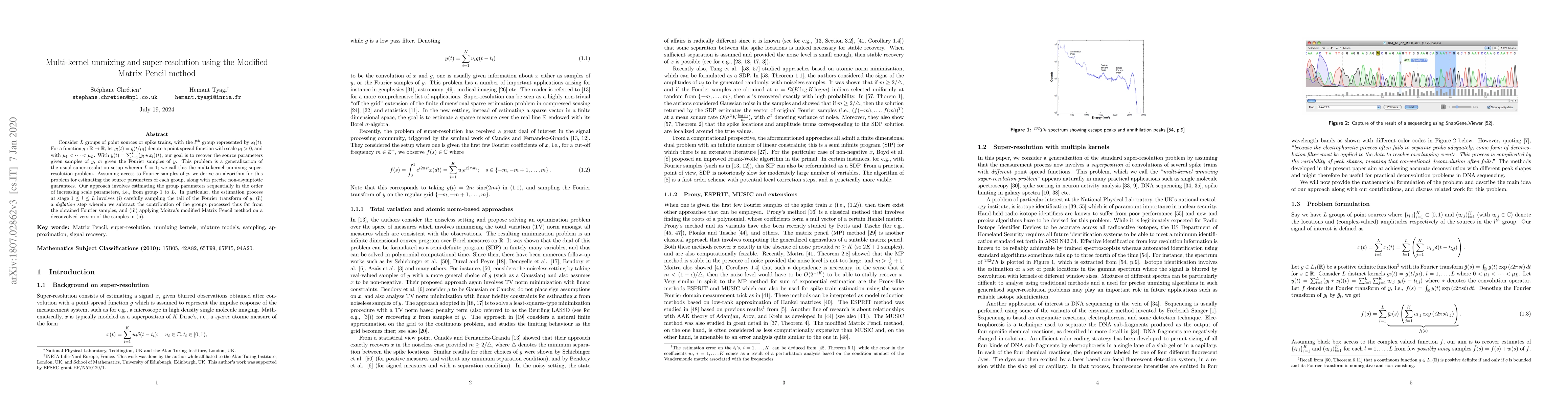 This paper proposes an algorithm for the multi-kernel unmixing super-resolution problem using the Modified Matrix Pencil method. It sequentially estimates source parameters by sampling the Fourier transform tail, deflating previous contributions, and applying the Matrix Pencil method on deconvolved samples.