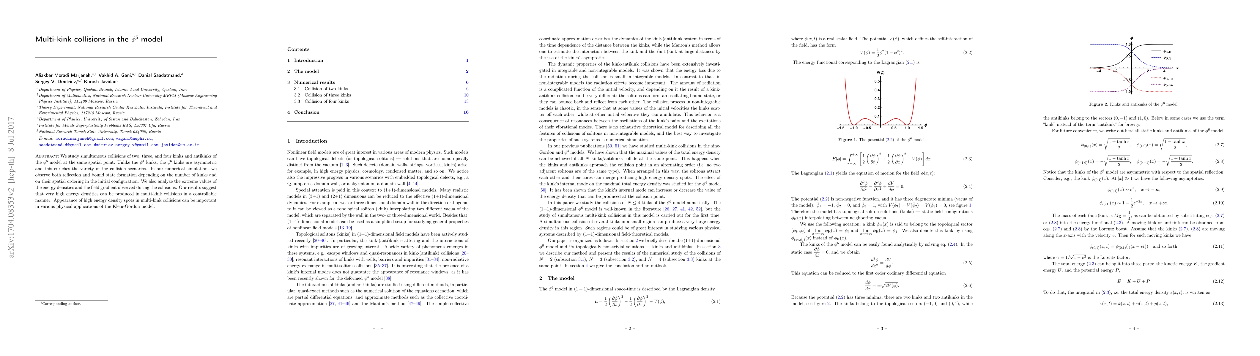 We study simultaneous collisions of two, three, and four kinks and antikinks of the $\phi^6$ model at the same spatial point. Unlike the $\phi^4$ kinks, the $\phi^6$ kinks are asymmetric and this enriches the variety of the collision scenarios. In our numerical simulations we observe both reflection and bound state formation depending on the number of kinks and on their spatial ordering in the initial configuration. We also analyze the extreme values of the energy densities and the field gradient observed during the collisions. Our results suggest that very high energy densities can be produced in multi-kink collisions in a controllable manner. Appearance of high energy density spots in multi-kink collisions can be important in various physical applications of the Klein-Gordon model.