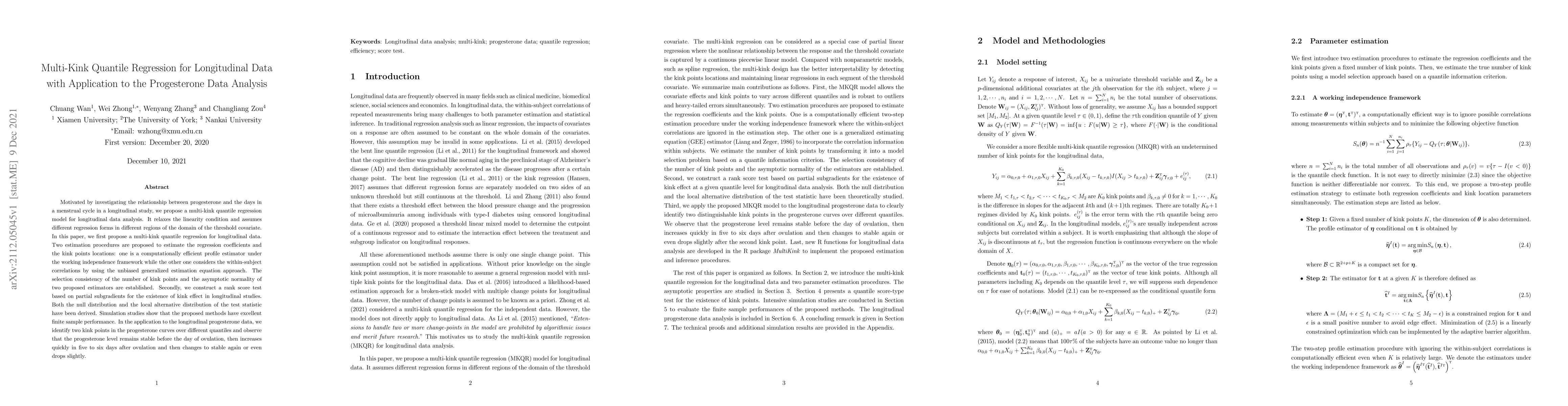 This paper proposes a multi-kink quantile regression model for analyzing longitudinal data, focusing on the relationship between progesterone levels and days in the menstrual cycle. It introduces two estimation methods and a rank score test for detecting kink effects, demonstrating effective performance through simulations and application to progesterone data.