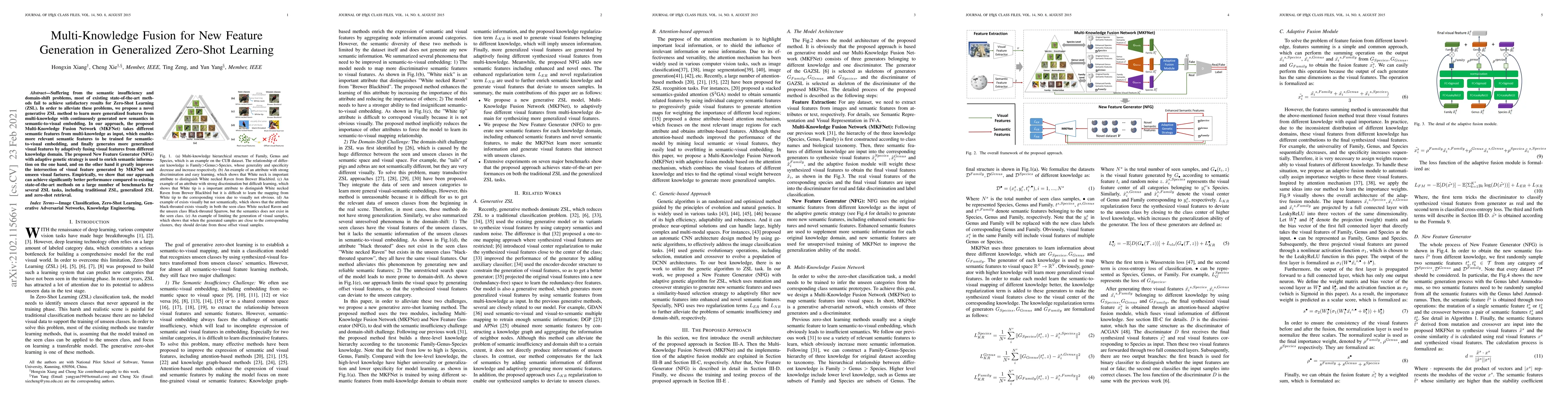 This paper proposes a Multi-Knowledge Fusion Network (MKFNet) and a New Feature Generator (NFG) to tackle semantic insufficiency and domain-shift issues in Zero-Shot Learning (ZSL), achieving better performance on benchmarks for traditional, generalized ZSL, and zero-shot retrieval. The approach fuses multi-knowledge for semantic-to-visual embedding and adaptively generates new features to enhance generalization.