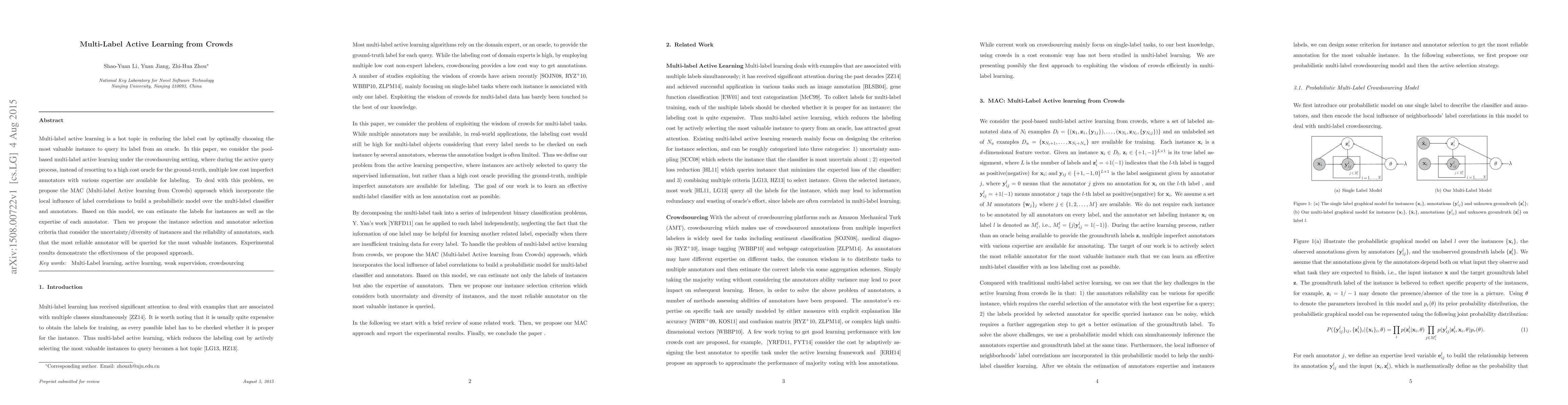 This paper proposes the MAC approach for multi-label active learning in crowdsourcing settings, aiming to reduce labeling costs by leveraging low-cost imperfect annotators. The MAC method builds a probabilistic model to estimate instance labels and annotator expertise, optimizing instance and annotator selection based on uncertainty and reliability.