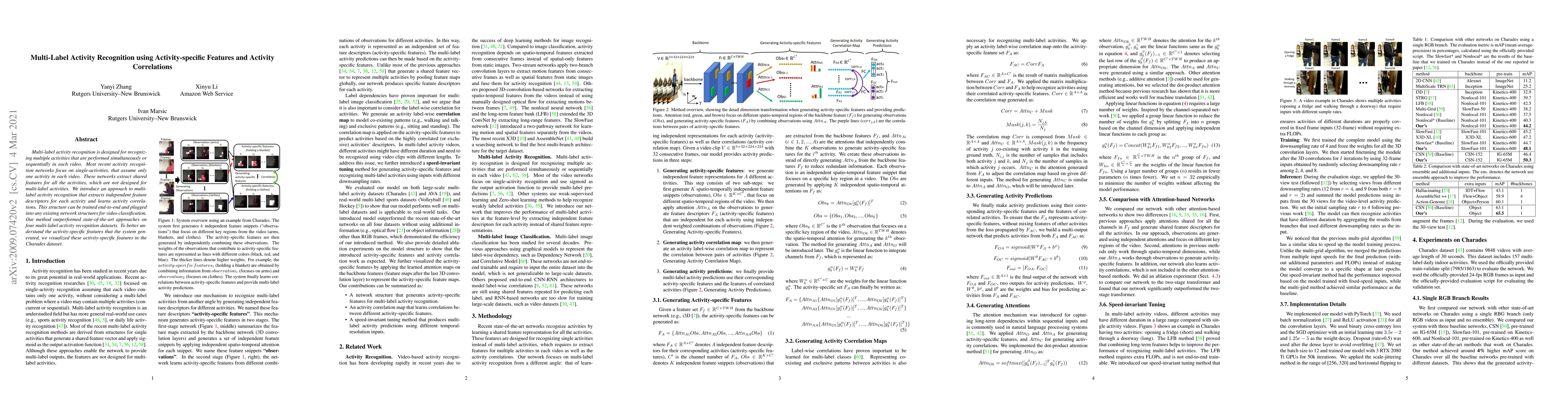 This paper proposes a novel approach to multi-label activity recognition that extracts independent features for each activity and learns correlations between them, outperforming existing methods on multiple datasets. The method can be integrated into existing video classification networks.