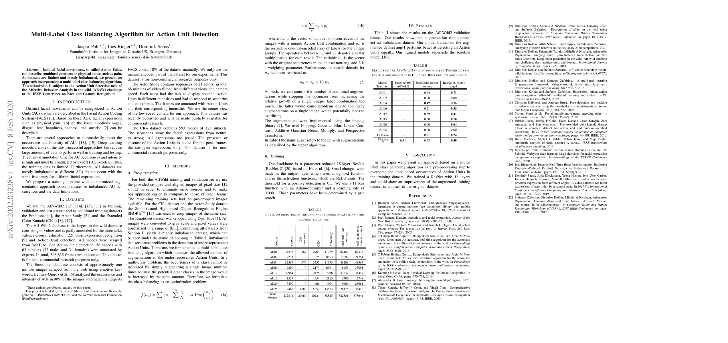 Isolated facial movements, so-called Action Units, can describe combined emotions or physical states such as pain. As datasets are limited and mostly imbalanced, we present an approach incorporating a multi-label class balancing algorithm. This submission is subject to the Action Unit detection task of the Affective Behavior Analysis in-the-wild (ABAW) challenge at the IEEE Conference on Face and Gesture Recognition 2020.