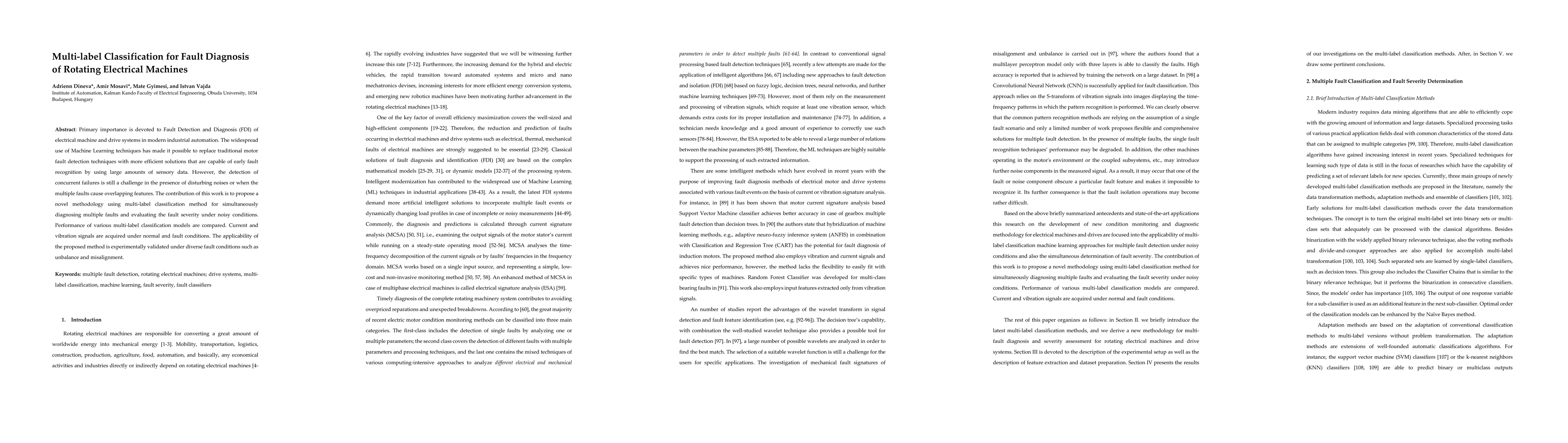 This paper proposes a novel multi-label classification methodology for diagnosing multiple faults in rotating electrical machines, addressing the challenge of concurrent failures under noisy conditions. The effectiveness of various multi-label classification models is evaluated using experimental data from current and vibration signals, validated under diverse fault conditions.
