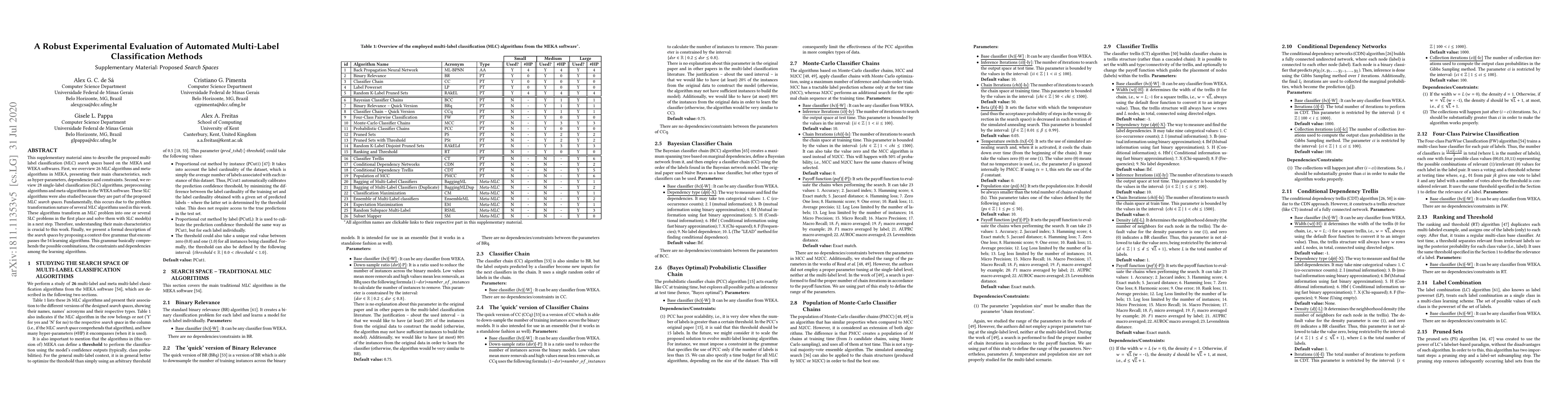 This supplementary material aims to describe the proposed multi-label classification (MLC) search spaces based on the MEKA and WEKA softwares. First, we overview 26 MLC algorithms and meta-algorithms in MEKA, presenting their main characteristics, such as hyper-parameters, dependencies and constraints. Second, we review 28 single-label classification (SLC) algorithms, preprocessing algorithms and meta-algorithms in the WEKA software. These SLC algorithms were also studied because they are part of the proposed MLC search spaces. Fundamentally, this occurs due to the problem transformation nature of several MLC algorithms used in this work. These algorithms transform an MLC problem into one or several SLC problems in the first place and solve them with SLC model(s) in a next step. Therefore, understanding their main characteristics is crucial to this work. Finally, we present a formal description of the search spaces by proposing a context-free grammar that encompasses the 54 learning algorithms. This grammar basically comprehends the possible combinations, the constraints and dependencies among the learning algorithms.