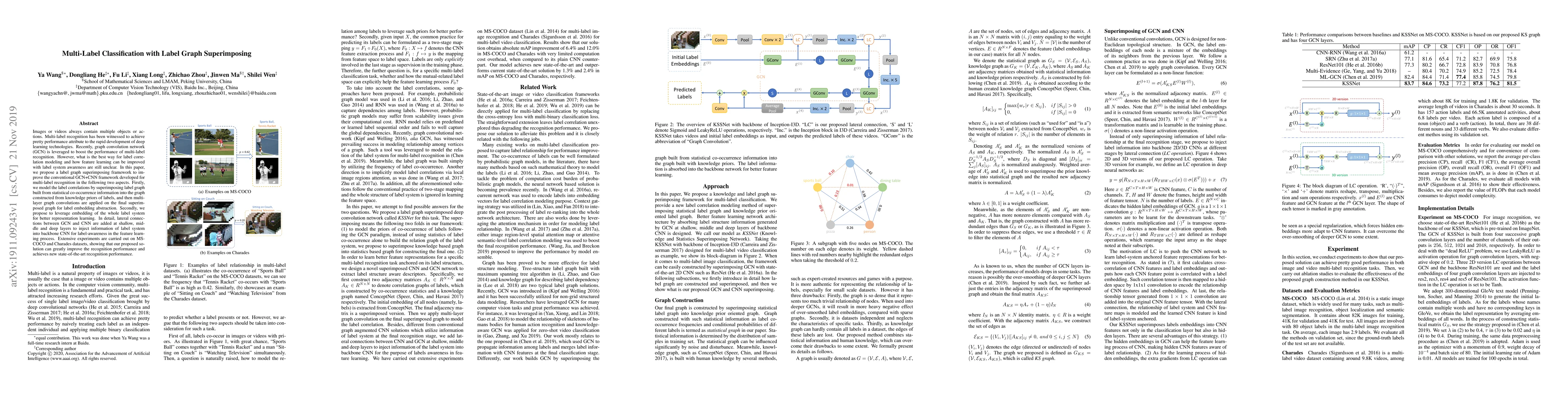 This paper proposes a label graph superimposing framework to enhance multi-label recognition using graph convolution networks. It models label correlations by combining statistical co-occurrence and knowledge priors, and incorporates label system awareness into CNN feature learning through lateral connections, achieving state-of-the-art performance on MS-COCO and Charades datasets.