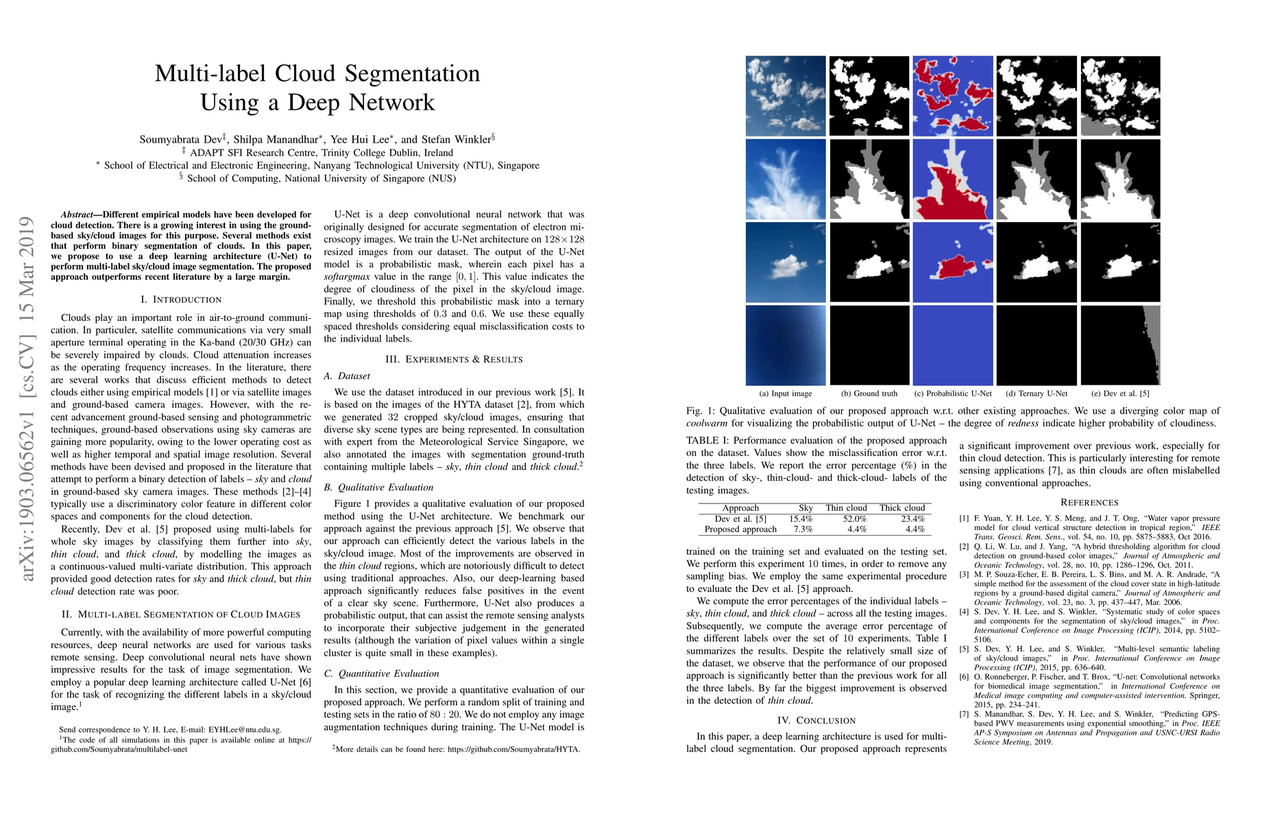 Different empirical models have been developed for cloud detection. There is a growing interest in using the ground-based sky/cloud images for this purpose. Several methods exist that perform binary segmentation of clouds. In this paper, we propose to use a deep learning architecture (U-Net) to perform multi-label sky/cloud image segmentation. The proposed approach outperforms recent literature by a large margin.