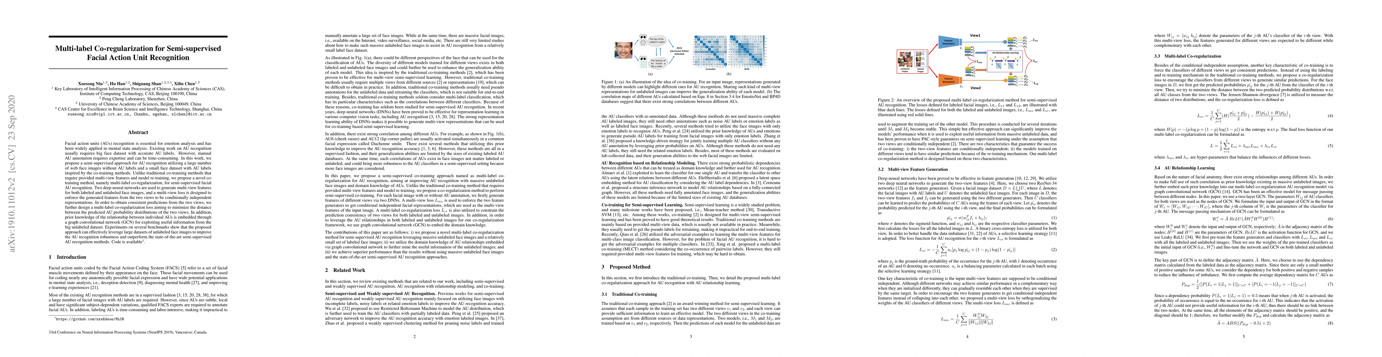 This paper proposes a semi-supervised method for facial action unit (AU) recognition using multi-label co-regularization. It leverages large unlabeled web face datasets and a small labeled dataset, employing two deep neural networks and a graph convolutional network to enhance AU recognition accuracy.