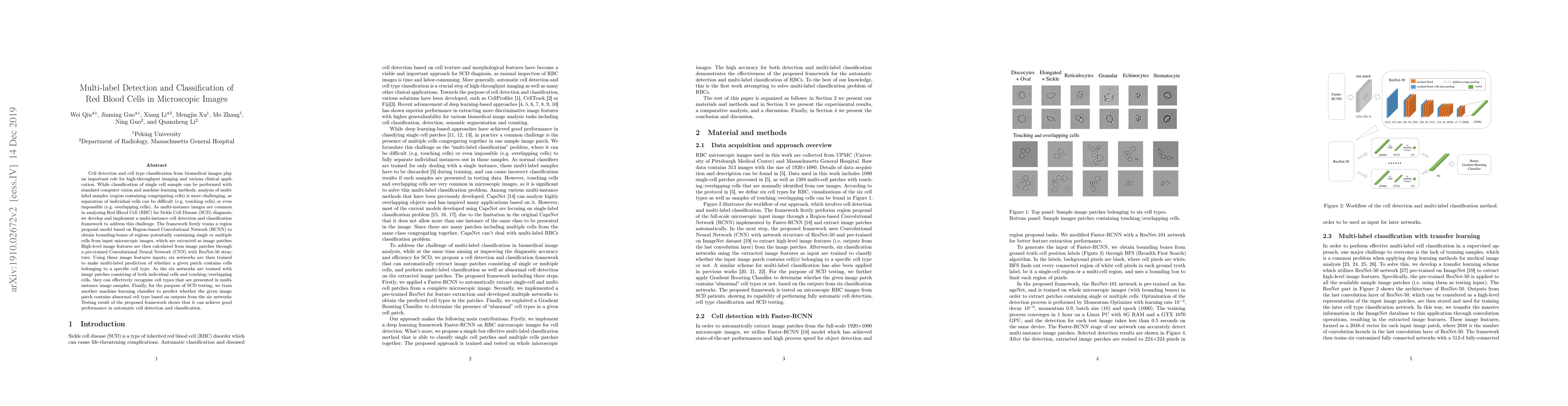 Cell detection and cell type classification from biomedical images play an important role for high-throughput imaging and various clinical application. While classification of single cell sample can be performed with standard computer vision and machine learning methods, analysis of multi-label samples (region containing congregating cells) is more challenging, as separation of individual cells can be difficult (e.g. touching cells) or even impossible (e.g. overlapping cells). As multi-instance images are common in analyzing Red Blood Cell (RBC) for Sickle Cell Disease (SCD) diagnosis, we develop and implement a multi-instance cell detection and classification framework to address this challenge. The framework firstly trains a region proposal model based on Region-based Convolutional Network (RCNN) to obtain bounding-boxes of regions potentially containing single or multiple cells from input microscopic images, which are extracted as image patches. High-level image features are then calculated from image patches through a pre-trained Convolutional Neural Network (CNN) with ResNet-50 structure. Using these image features inputs, six networks are then trained to make multi-label prediction of whether a given patch contains cells belonging to a specific cell type. As the six networks are trained with image patches consisting of both individual cells and touching/overlapping cells, they can effectively recognize cell types that are presented in multi-instance image samples. Finally, for the purpose of SCD testing, we train another machine learning classifier to predict whether the given image patch contains abnormal cell type based on outputs from the six networks. Testing result of the proposed framework shows that it can achieve good performance in automatic cell detection and classification.