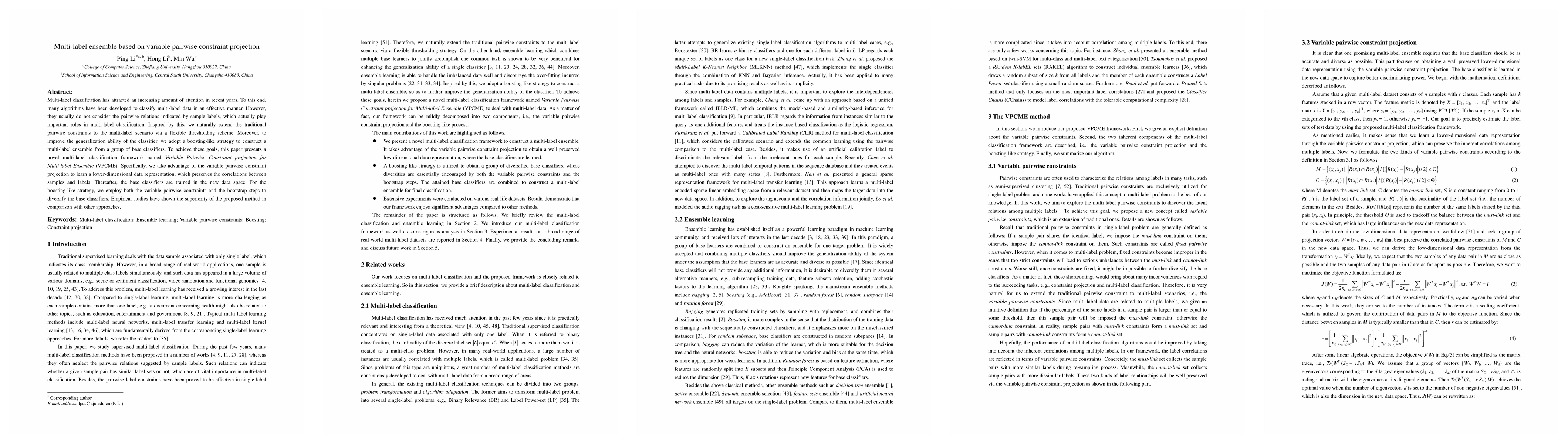 This paper introduces a novel multi-label classification framework called VPCME that incorporates variable pairwise constraint projection to preserve label correlations and employs a boosting-like ensemble strategy to enhance classifier generalization, demonstrating superior performance in empirical studies.