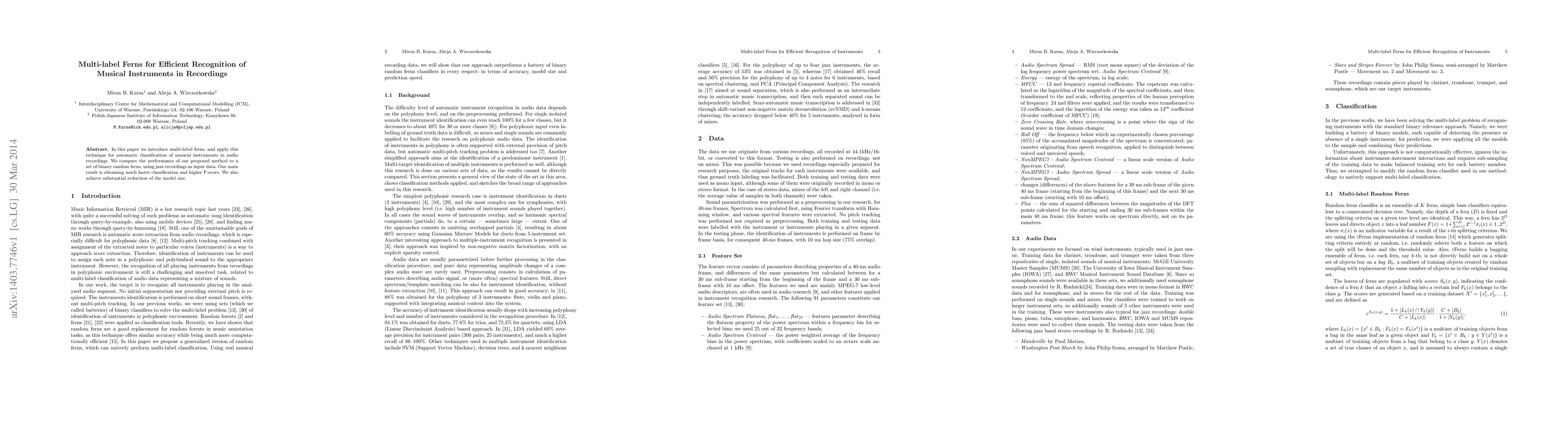 In this paper we introduce multi-label ferns, and apply this technique for automatic classification of musical instruments in audio recordings. We compare the performance of our proposed method to a set of binary random ferns, using jazz recordings as input data. Our main result is obtaining much faster classification and higher F-score. We also achieve substantial reduction of the model size.