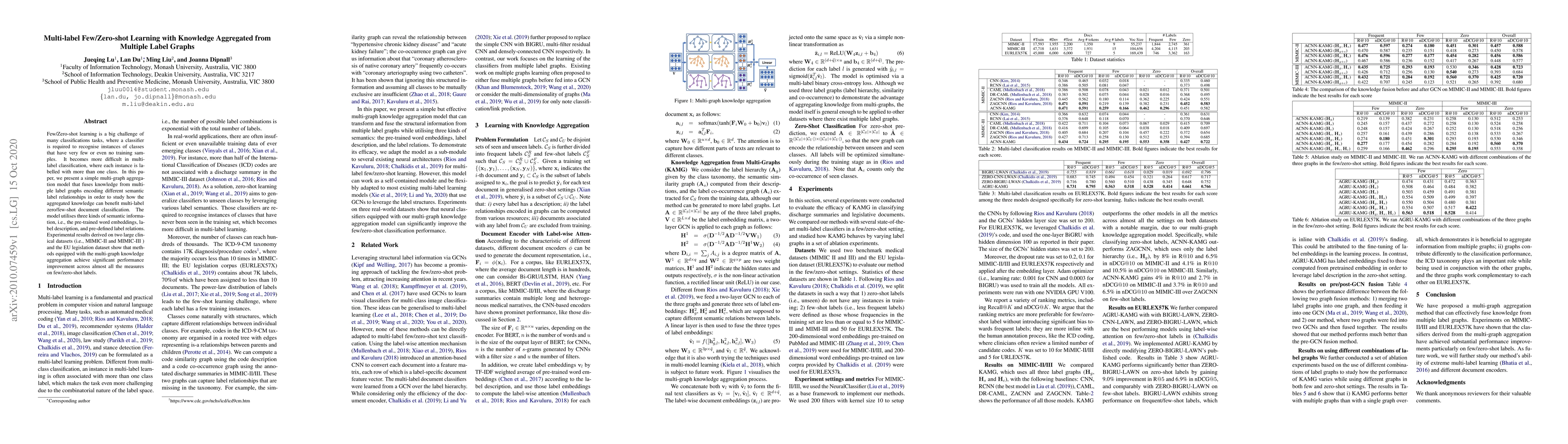 This paper proposes a multi-graph aggregation model to enhance multi-label few/zero-shot learning by fusing knowledge from various label graphs. The model incorporates pre-trained word embeddings, label descriptions, and predefined label relations, leading to significant performance improvements on several datasets.