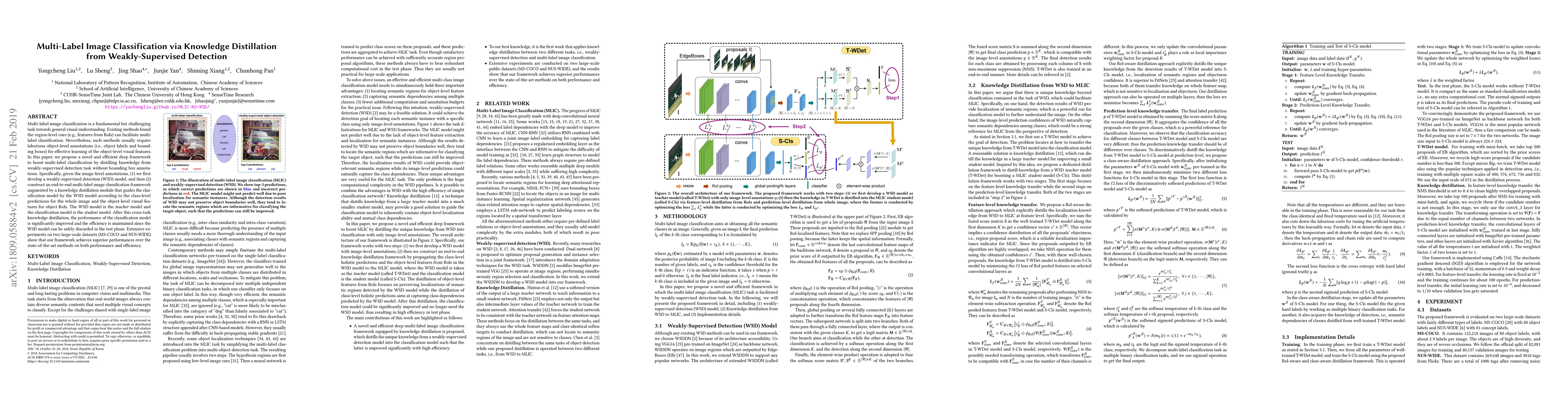 This paper proposes a novel deep framework for multi-label image classification that leverages knowledge distillation from a weakly-supervised detection model, eliminating the need for object-level annotations. The framework significantly improves classification performance and maintains efficiency by distilling knowledge from an image-level weakly-supervised detection model to guide the multi-label classification model.
