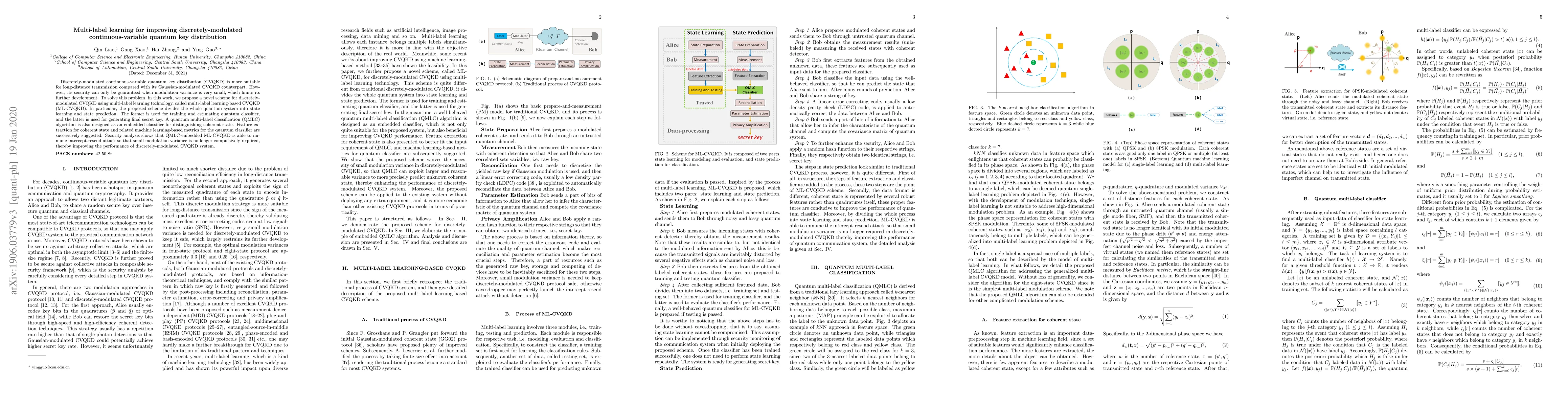 This paper proposes a multi-label learning-based CVQKD (ML-CVQKD) scheme to enhance discretely-modulated continuous-variable quantum key distribution, enabling it to operate with larger modulation variances and thus improving long-distance transmission security. The scheme employs quantum multi-label classification for coherent state detection and feature extraction, ensuring immunity against intercept-resend attacks.