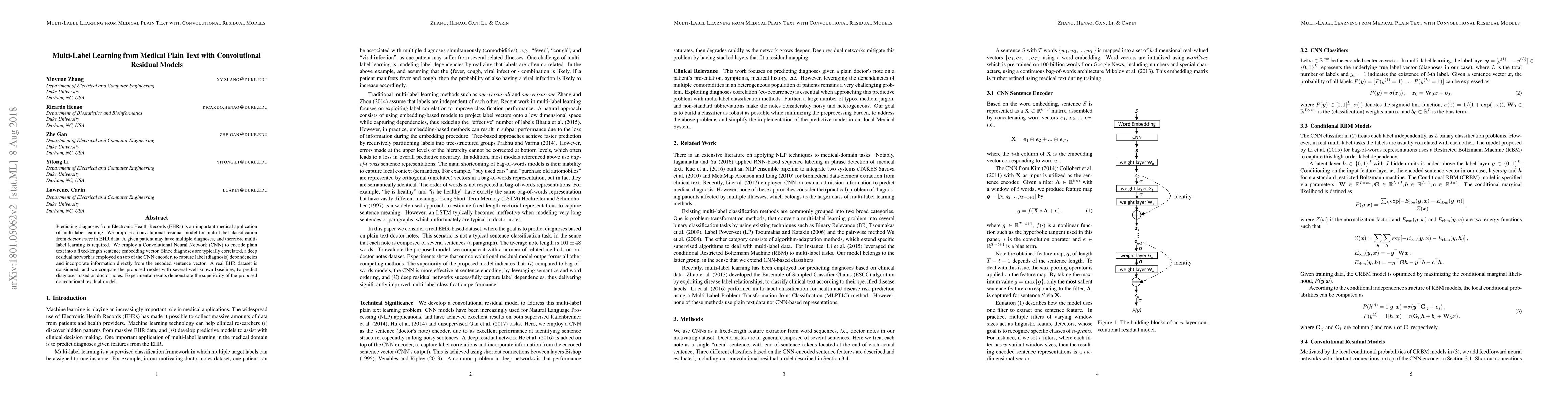 This paper proposes a convolutional residual model for multi-label classification to predict diagnoses from Electronic Health Records (EHRs) using doctor notes. The model employs a CNN to encode text and a deep residual network to capture diagnosis correlations, outperforming several baselines in experimental evaluations.