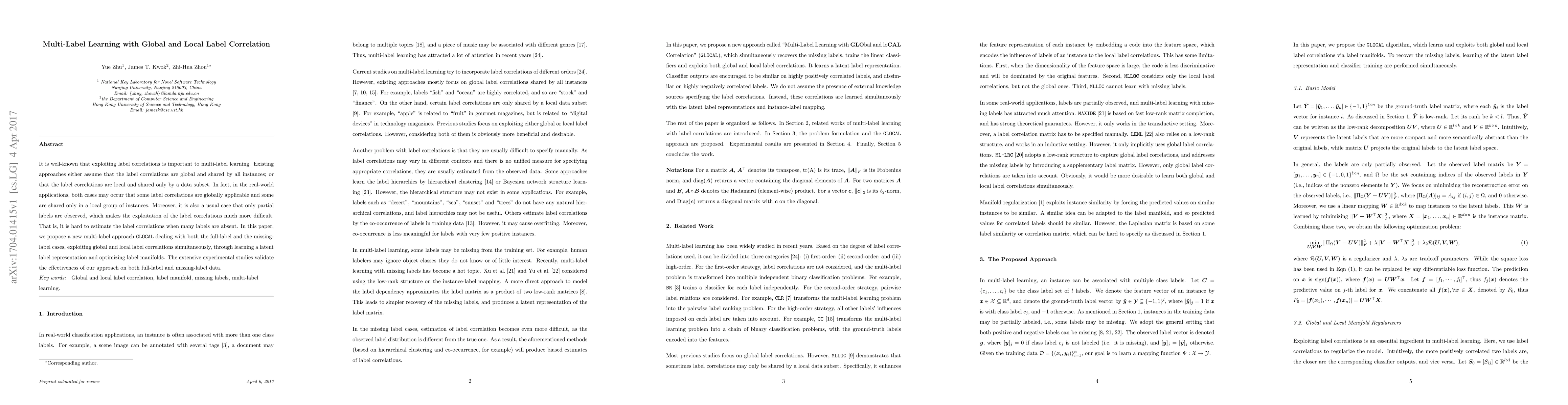 This paper proposes GLOCAL, a novel multi-label learning method that leverages both global and local label correlations to handle both fully labeled and partially labeled datasets. The approach learns a latent label representation and optimizes label manifolds, demonstrating effectiveness through extensive experiments.