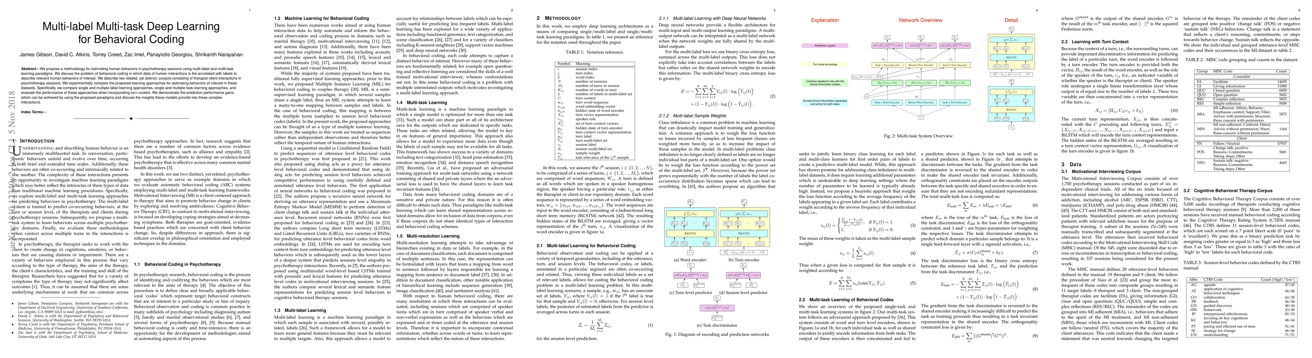 We propose a methodology for estimating human behaviors in psychotherapy sessions using mutli-label and multi-task learning paradigms. We discuss the problem of behavioral coding in which data of human interactions is the annotated with labels to describe relevant human behaviors of interest. We describe two related, yet distinct, corpora consisting of therapist client interactions in psychotherapy sessions. We experimentally compare the proposed learning approaches for estimating behaviors of interest in these datasets. Specifically, we compare single and multiple label learning approaches, single and multiple task learning approaches, and evaluate the performance of these approaches when incorporating turn context. We demonstrate the prediction performance gains which can be achieved by using the proposed paradigms and discuss the insights these models provide into these complex interactions.