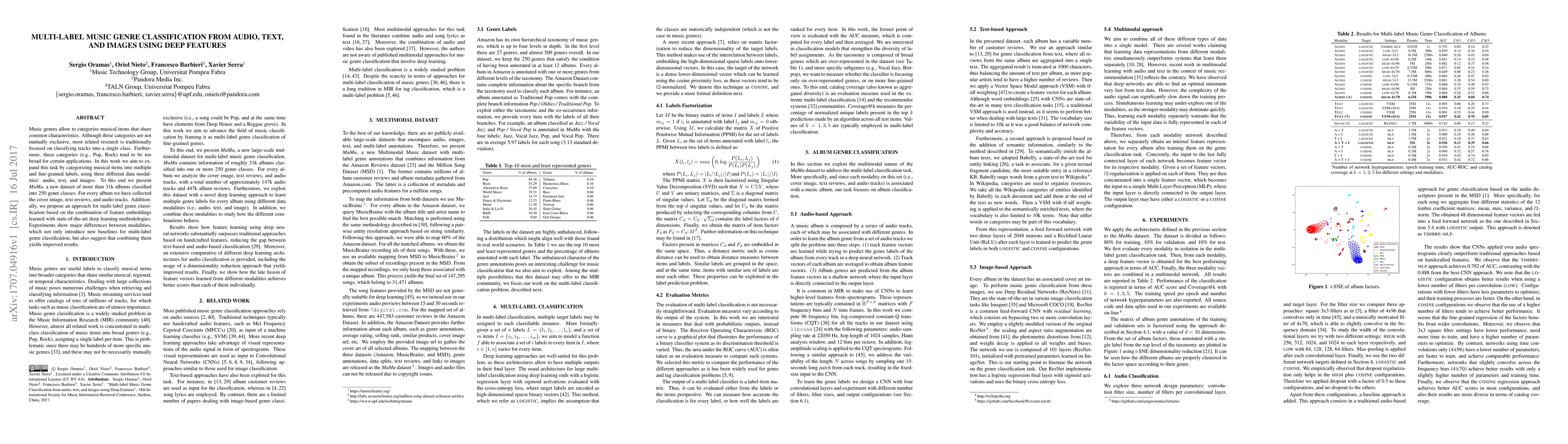 Music genres allow to categorize musical items that share common characteristics. Although these categories are not mutually exclusive, most related research is traditionally focused on classifying tracks into a single class. Furthermore, these categories (e.g., Pop, Rock) tend to be too broad for certain applications. In this work we aim to expand this task by categorizing musical items into multiple and fine-grained labels, using three different data modalities: audio, text, and images. To this end we present MuMu, a new dataset of more than 31k albums classified into 250 genre classes. For every album we have collected the cover image, text reviews, and audio tracks. Additionally, we propose an approach for multi-label genre classification based on the combination of feature embeddings learned with state-of-the-art deep learning methodologies. Experiments show major differences between modalities, which not only introduce new baselines for multi-label genre classification, but also suggest that combining them yields improved results.